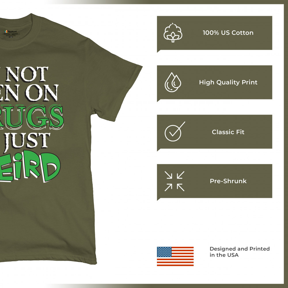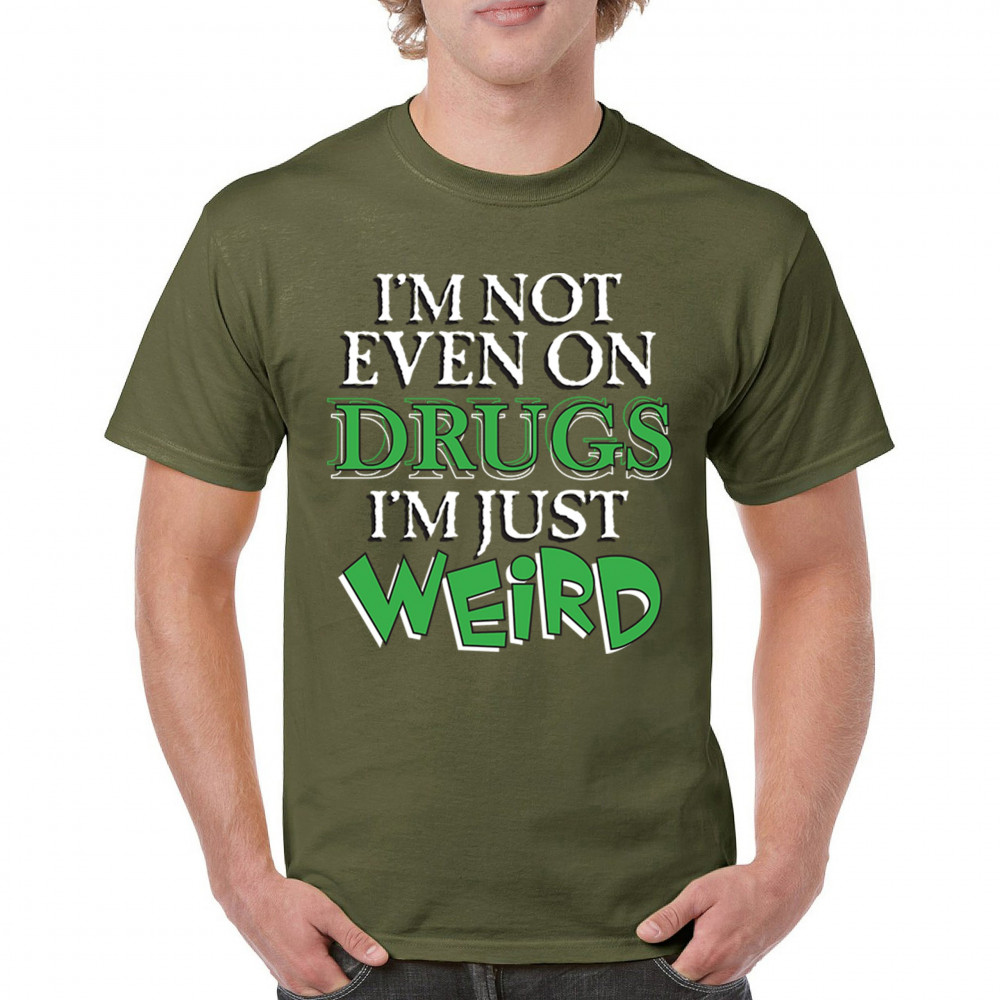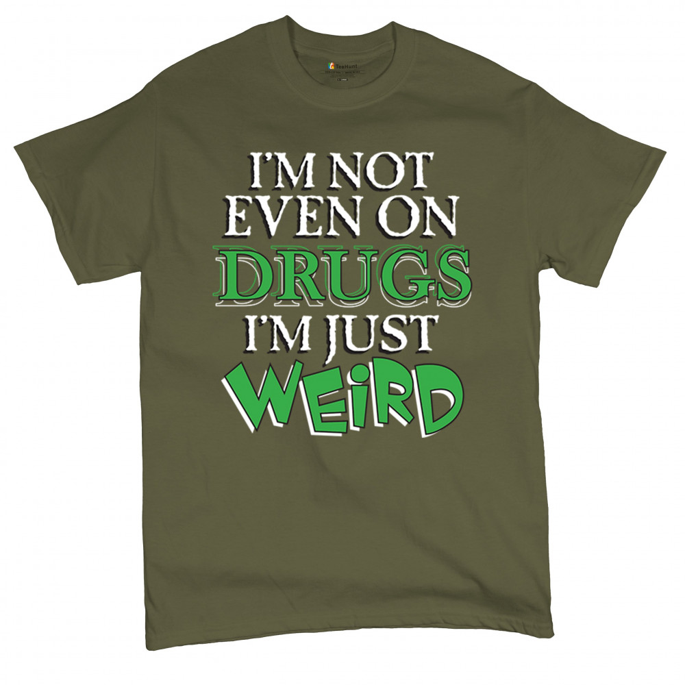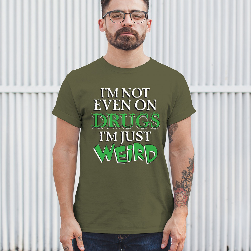 Bold weird design for introverts and quirky minds. Says “I'm not even on drugs I'm just weirdâ€â€”perfect for awkward humor and loud energy.