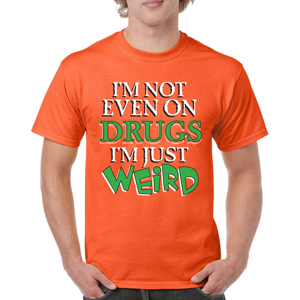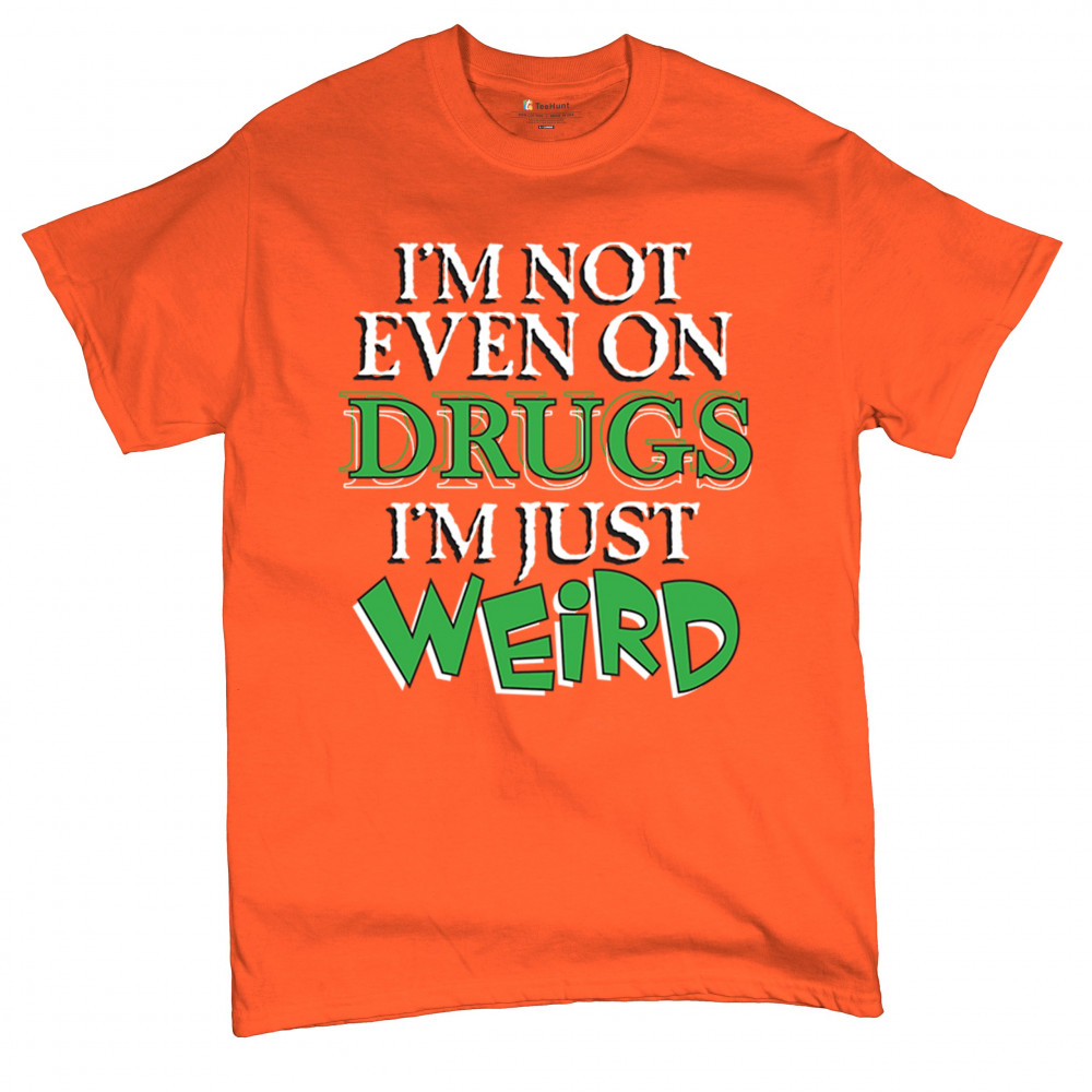 Bold weird design for introverts and quirky minds. Says “I'm not even on drugs I'm just weirdâ€â€”perfect for awkward humor and loud energy.