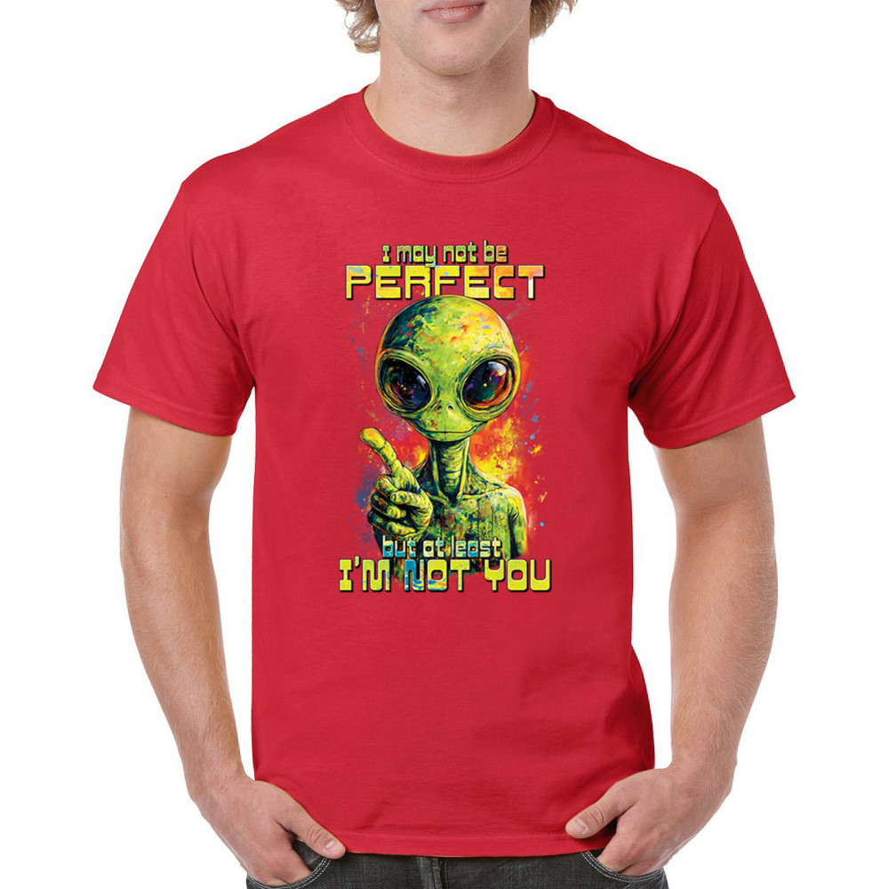 This smug alien design delivers sharp sarcastic humor with vibrant cosmic flair. Featuring a big-eyed extraterrestrial and the quote “I may not be perfect, but at least I’m not you,†it’s perfect for sci-fi fans, alien lovers, jokesters, and oddballs alike. A bold, funny statement for parties, UFO events, and festivals.