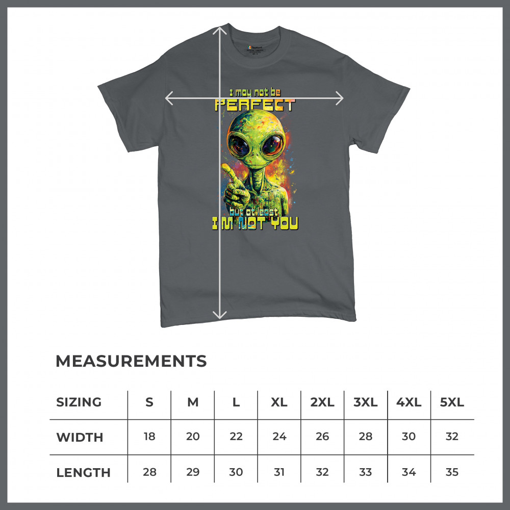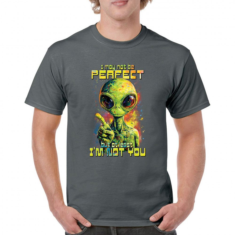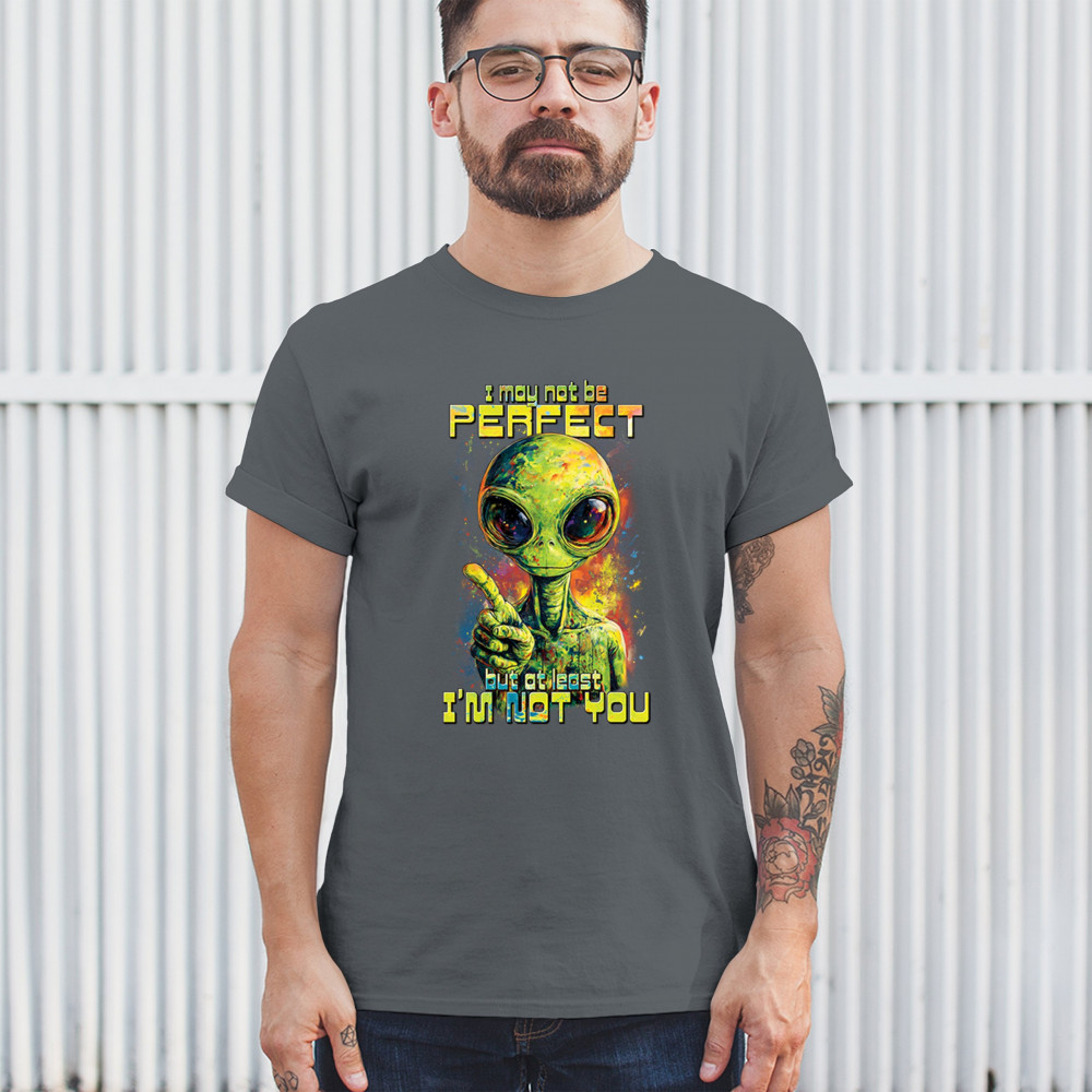 This smug alien design delivers sharp sarcastic humor with vibrant cosmic flair. Featuring a big-eyed extraterrestrial and the quote “I may not be perfect, but at least I’m not you,†it’s perfect for sci-fi fans, alien lovers, jokesters, and oddballs alike. A bold, funny statement for parties, UFO events, and festivals.
