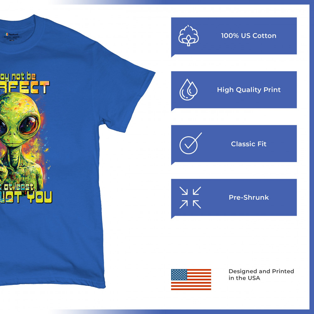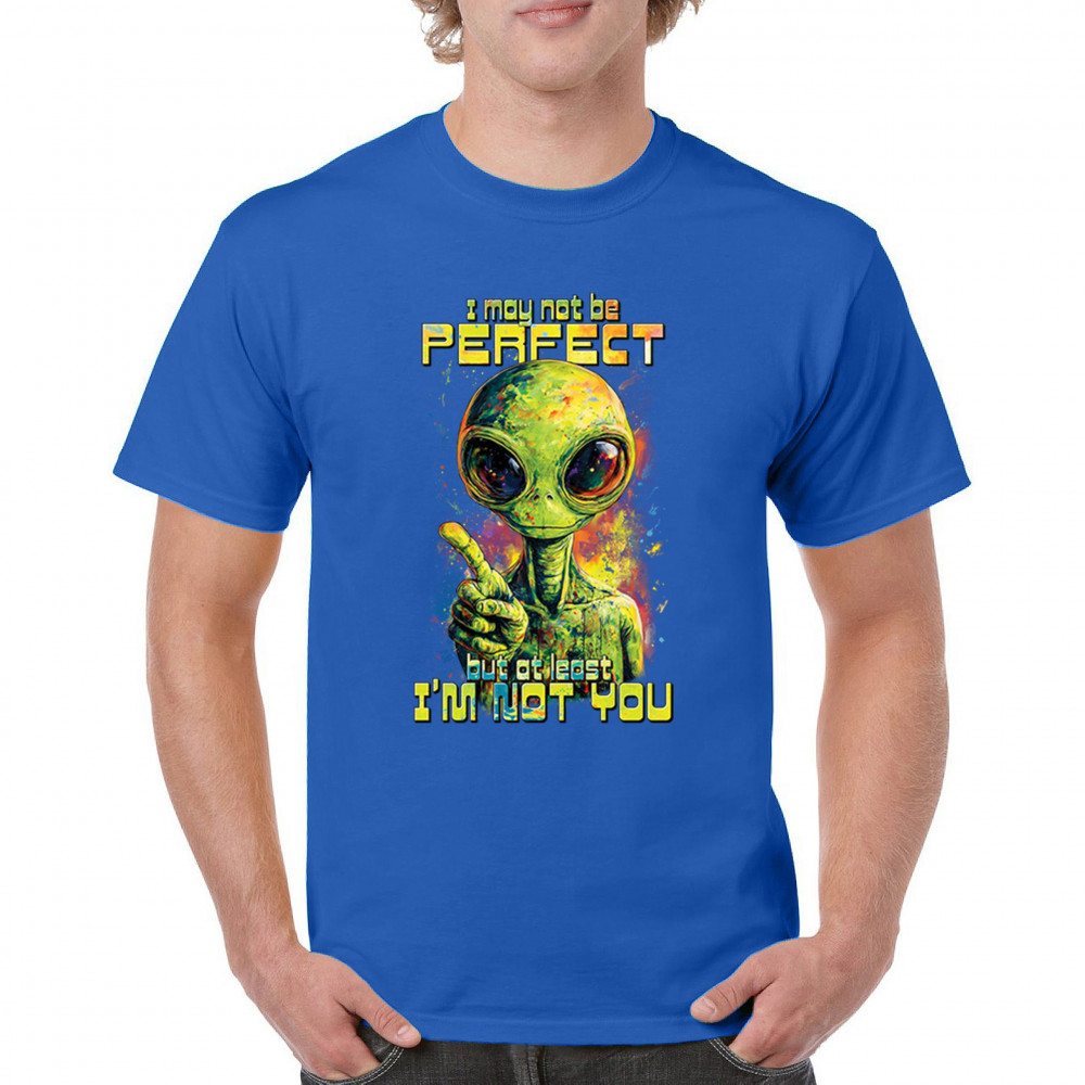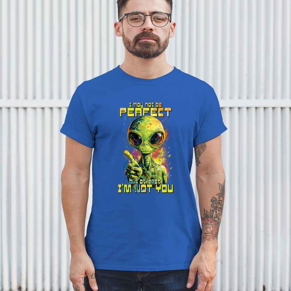 This smug alien design delivers sharp sarcastic humor with vibrant cosmic flair. Featuring a big-eyed extraterrestrial and the quote “I may not be perfect, but at least I’m not you,†it’s perfect for sci-fi fans, alien lovers, jokesters, and oddballs alike. A bold, funny statement for parties, UFO events, and festivals.