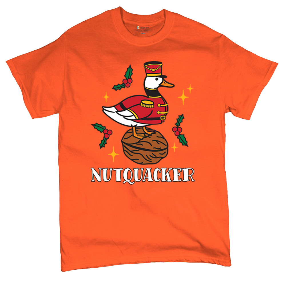 This hilarious Nutquacker design puts a festive spin on holiday humor, showcasing a duck dressed as a nutcracker standing on a walnut with holly accents and bright Christmas touches. A perfect choice for quirky gift-givers, holiday party outfits, and anyone who loves clever Christmas graphics that add personality, charm, and seasonal fun to their celebrations.