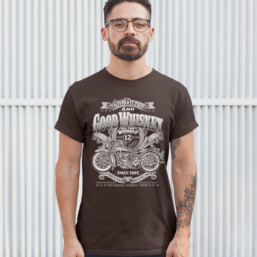 A print featuring a retro motorcycle. The print says: "Old bikes and good whiskey. Since 1903. Get better with age". In the center of the print there is a badge that says: "Old time whiskey, aged 12 years, brewed for bikers. Made in U.S.A". A great choice