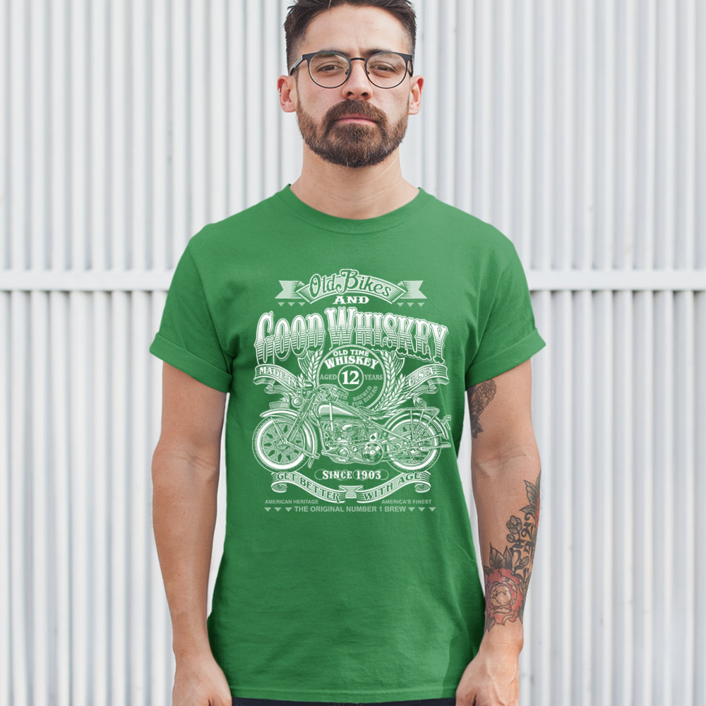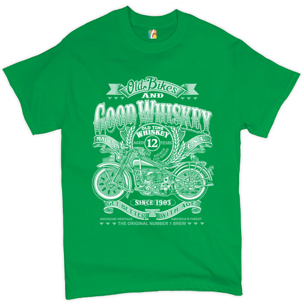 A print featuring a retro motorcycle. The print says: "Old bikes and good whiskey. Since 1903. Get better with age". In the center of the print there is a badge that says: "Old time whiskey, aged 12 years, brewed for bikers. Made in U.S.A". A great choice
