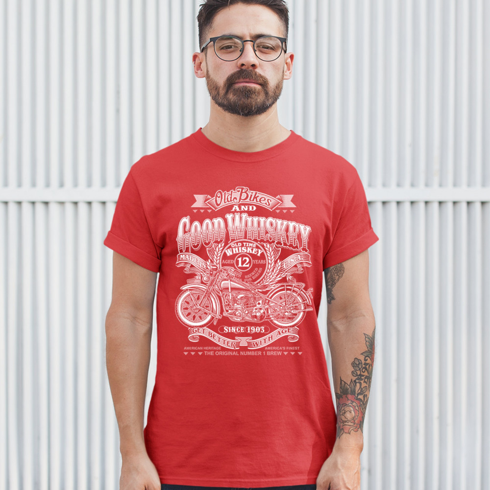 A print featuring a retro motorcycle. The print says: "Old bikes and good whiskey. Since 1903. Get better with age". In the center of the print there is a badge that says: "Old time whiskey, aged 12 years, brewed for bikers. Made in U.S.A". A great choice