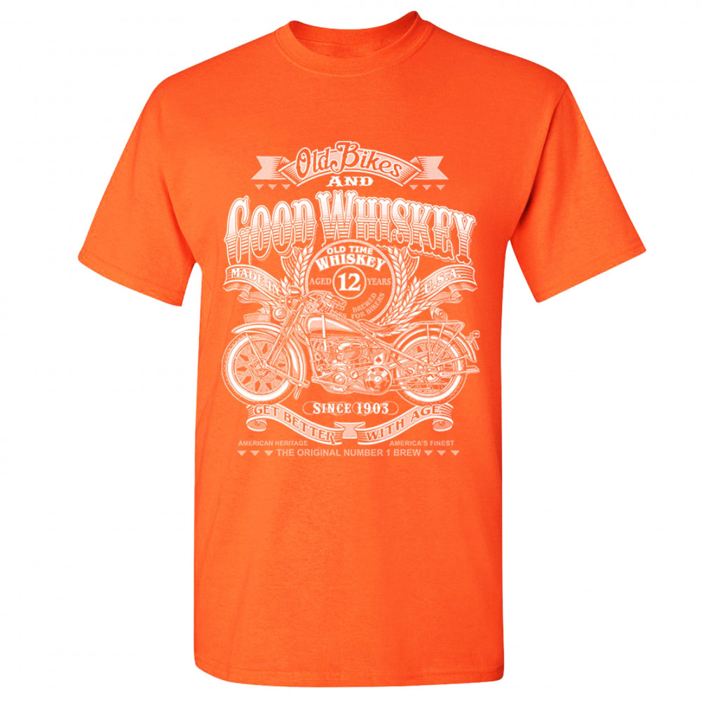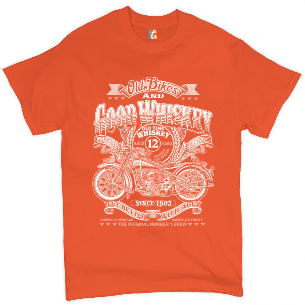 A print featuring a retro motorcycle. The print says: "Old bikes and good whiskey. Since 1903. Get better with age". In the center of the print there is a badge that says: "Old time whiskey, aged 12 years, brewed for bikers. Made in U.S.A". A great choice
