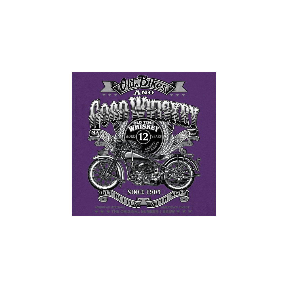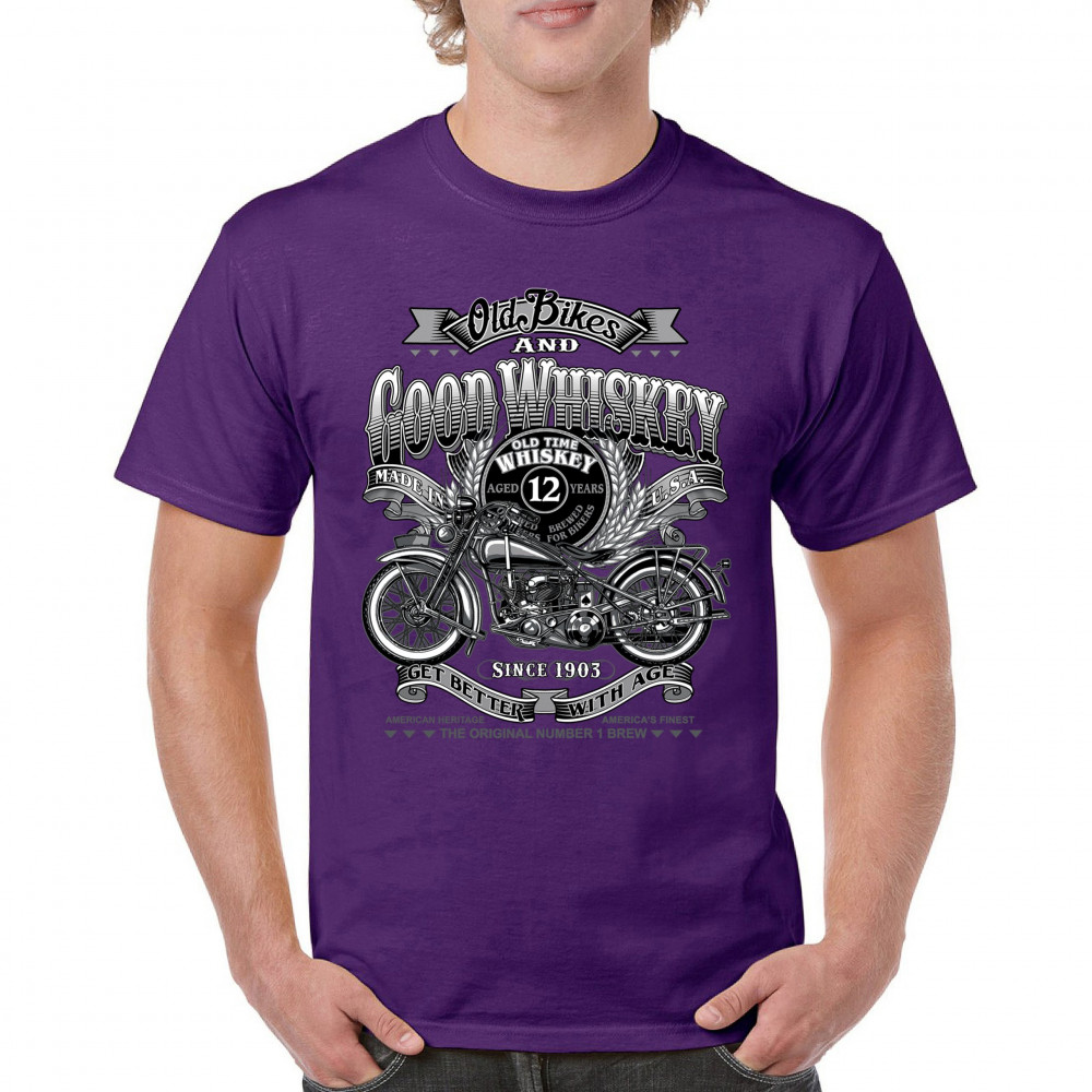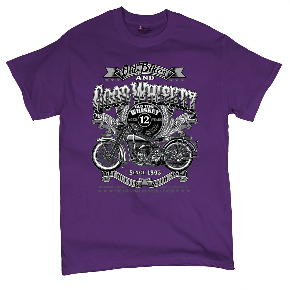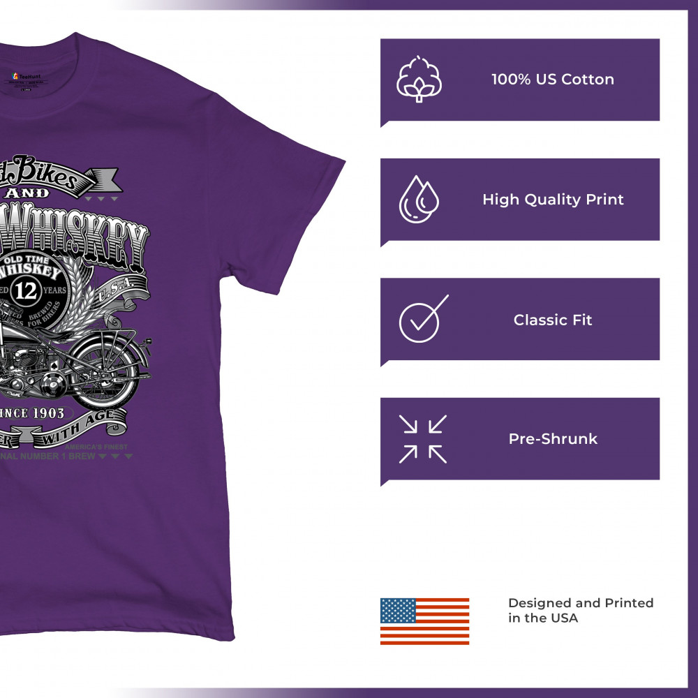 Vintage design with old bike, 12-year whiskey label, and 1903 tribute—perfect for bikers who ride hard and sip slow.