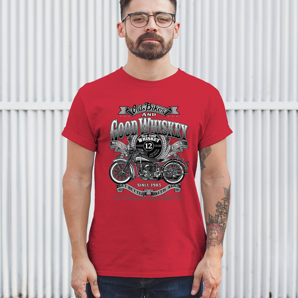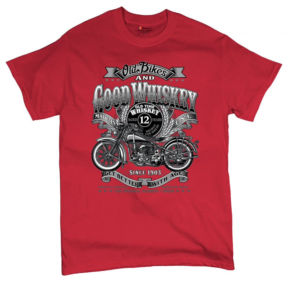 Vintage design with old bike, 12-year whiskey label, and 1903 tribute—perfect for bikers who ride hard and sip slow.