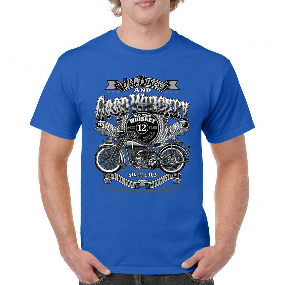 Vintage design with old bike, 12-year whiskey label, and 1903 tribute—perfect for bikers who ride hard and sip slow.