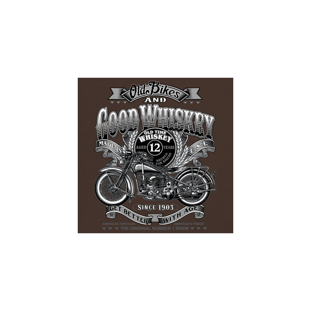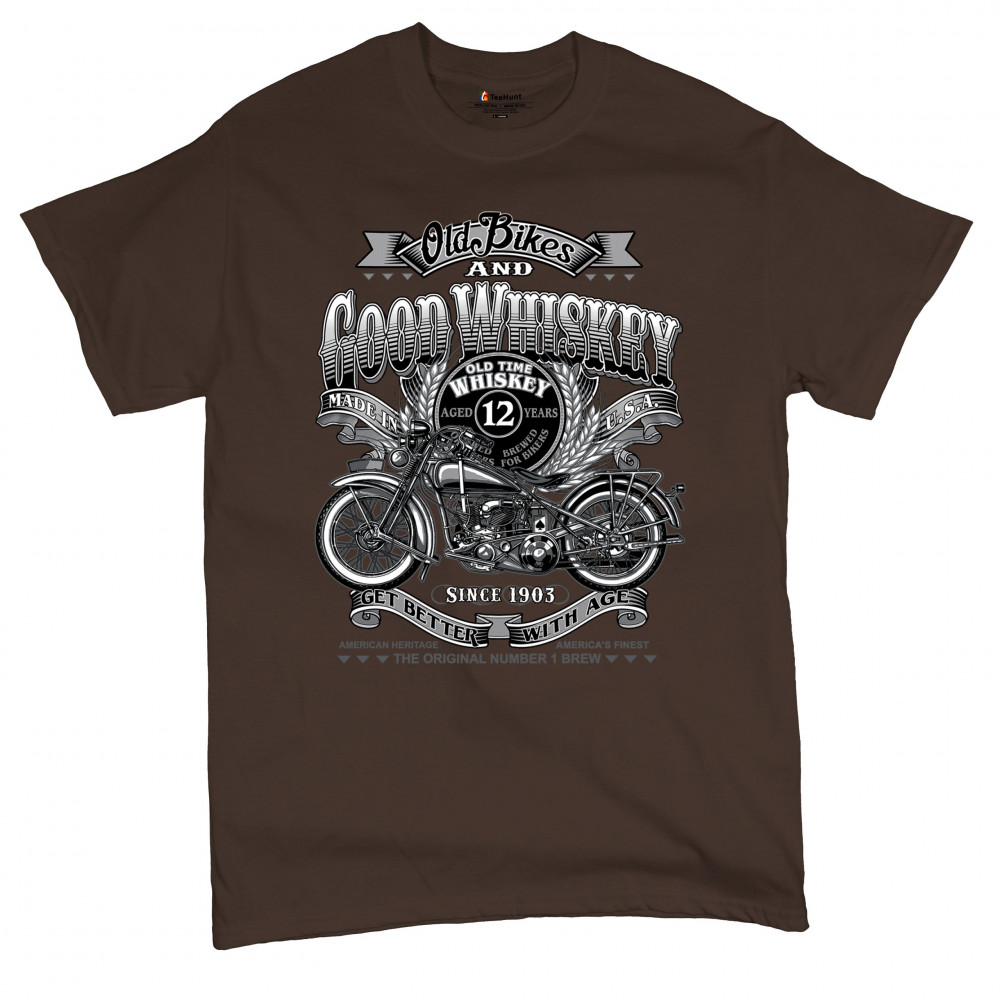 Vintage design with old bike, 12-year whiskey label, and 1903 tribute—perfect for bikers who ride hard and sip slow.