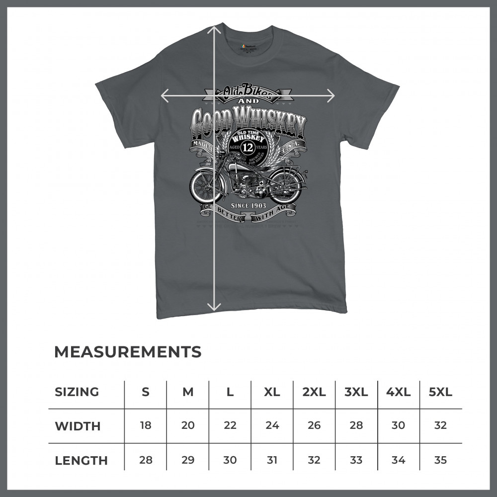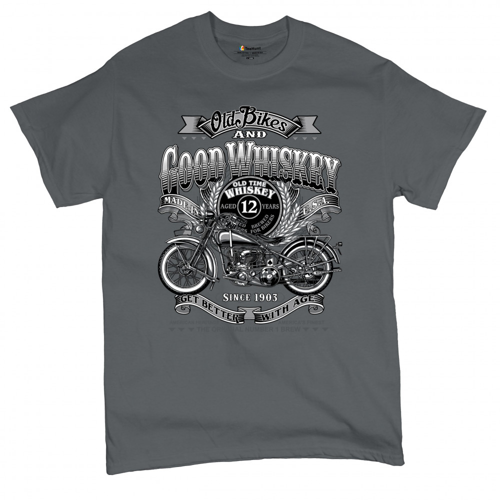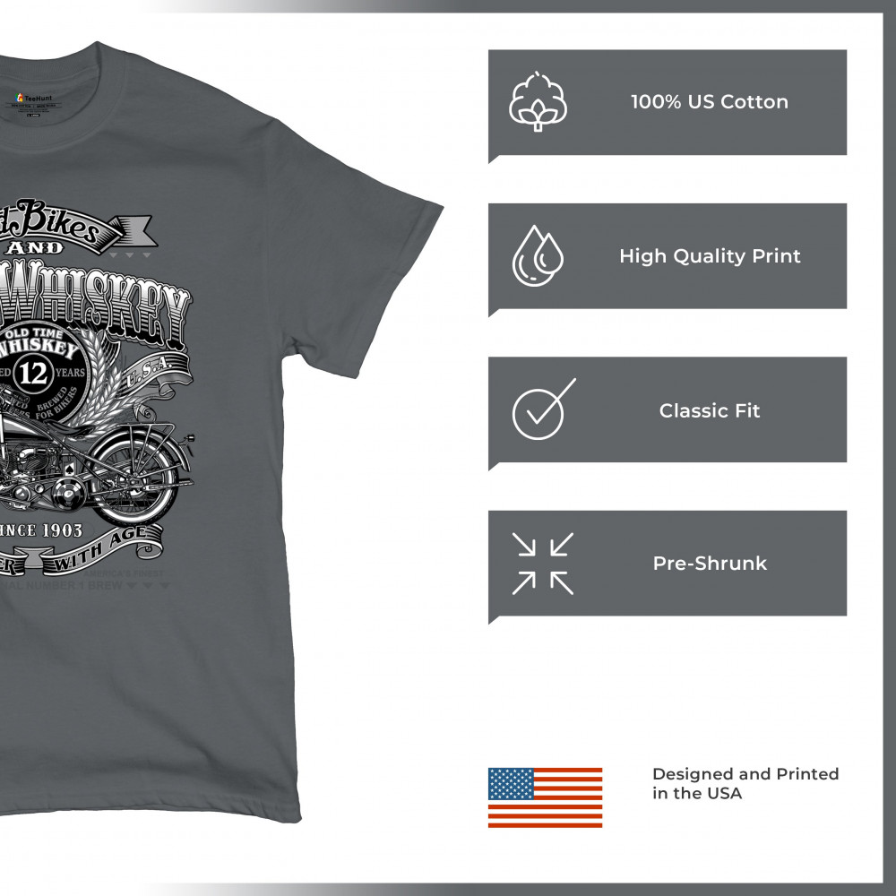 Vintage design with old bike, 12-year whiskey label, and 1903 tribute—perfect for bikers who ride hard and sip slow.