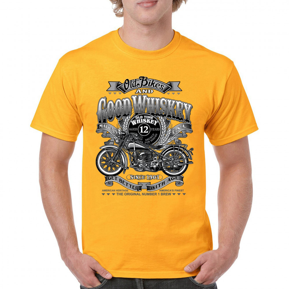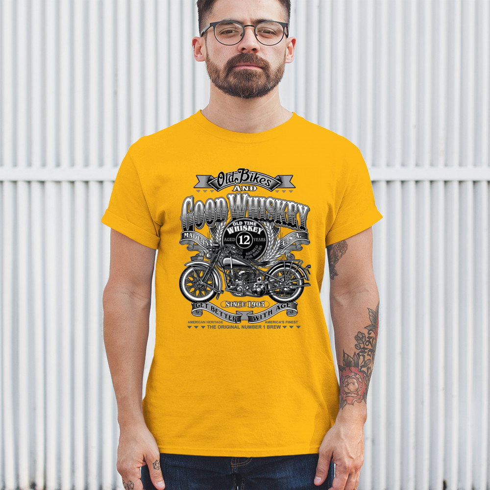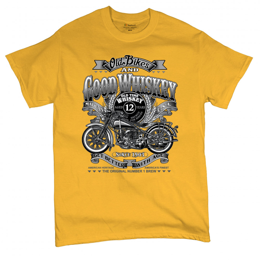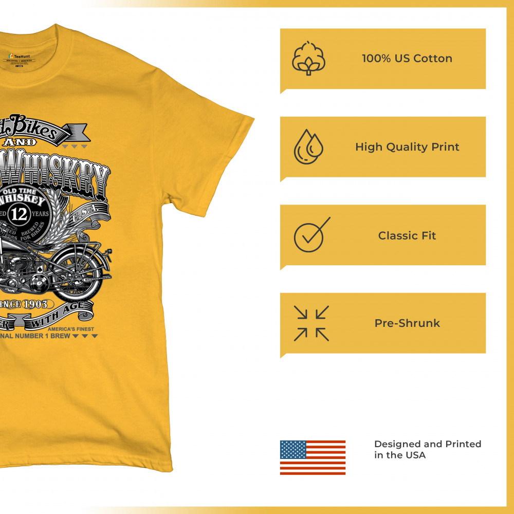 Vintage design with old bike, 12-year whiskey label, and 1903 tribute—perfect for bikers who ride hard and sip slow.