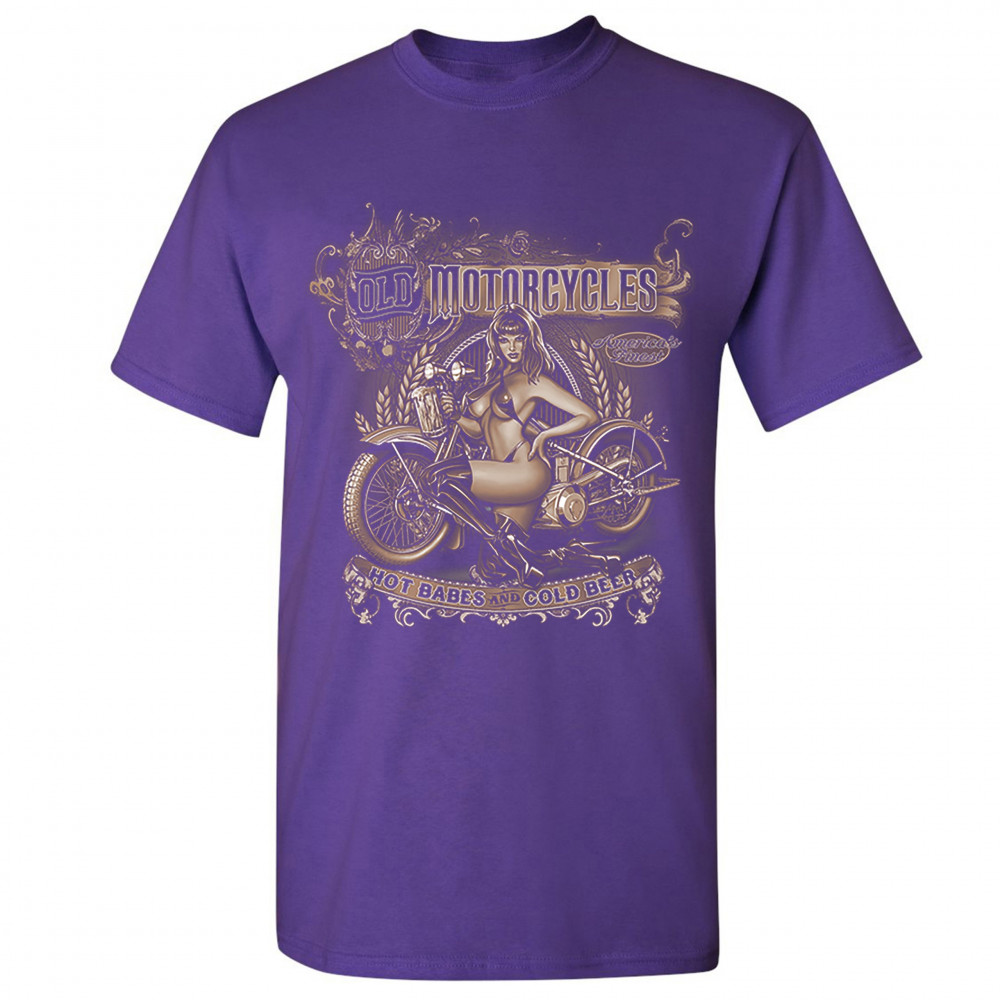OLD MOTORCYCLES HOT BABES AND COLD BEER t-shirt biker babe chopper men's tee purple