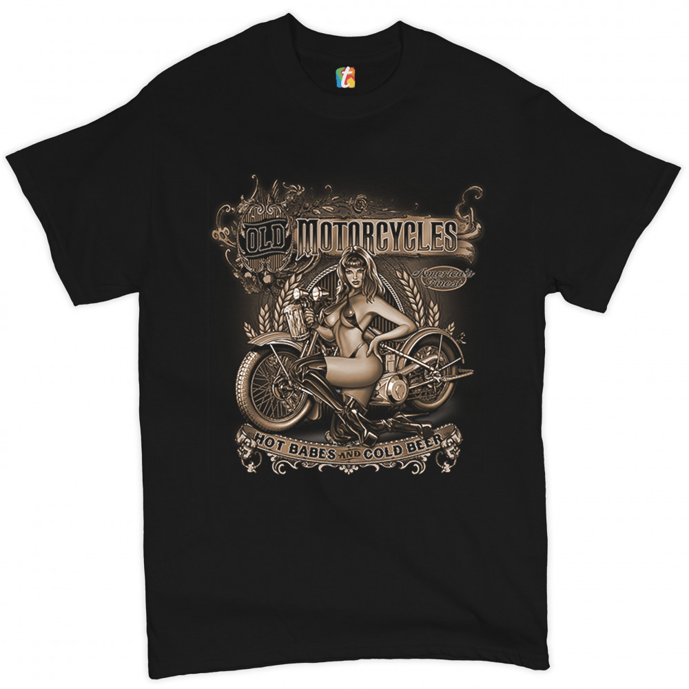 A print featuring a barely dressed sexy woman standing on one knee, holding a beer mug. Behind her there is a vintage motorcycle. The print says: "Old Motorcycles, America's Finest, Hot Babes and Cold Beer". A great choice for a motorcycle enthusiast.