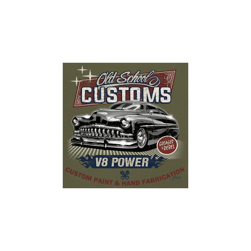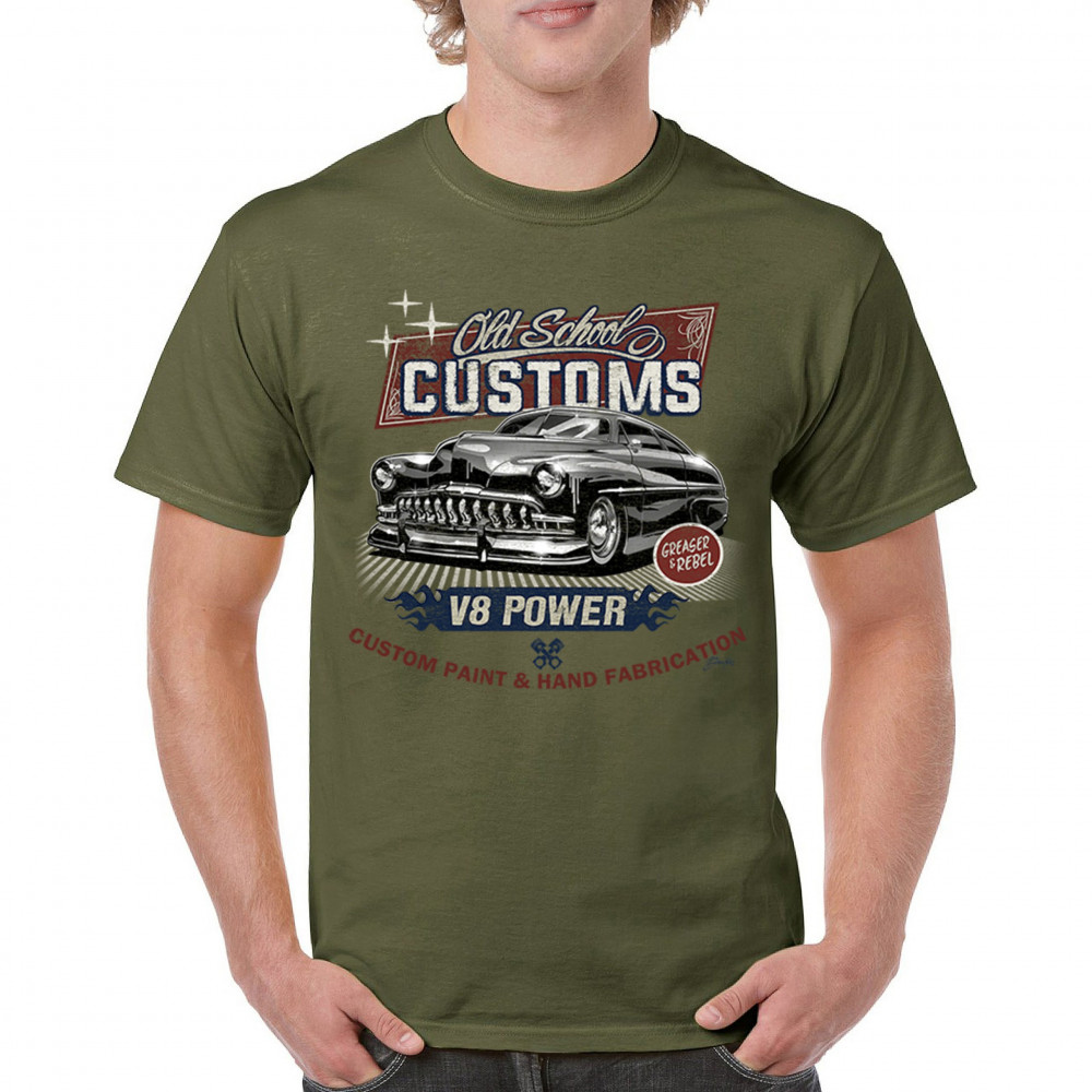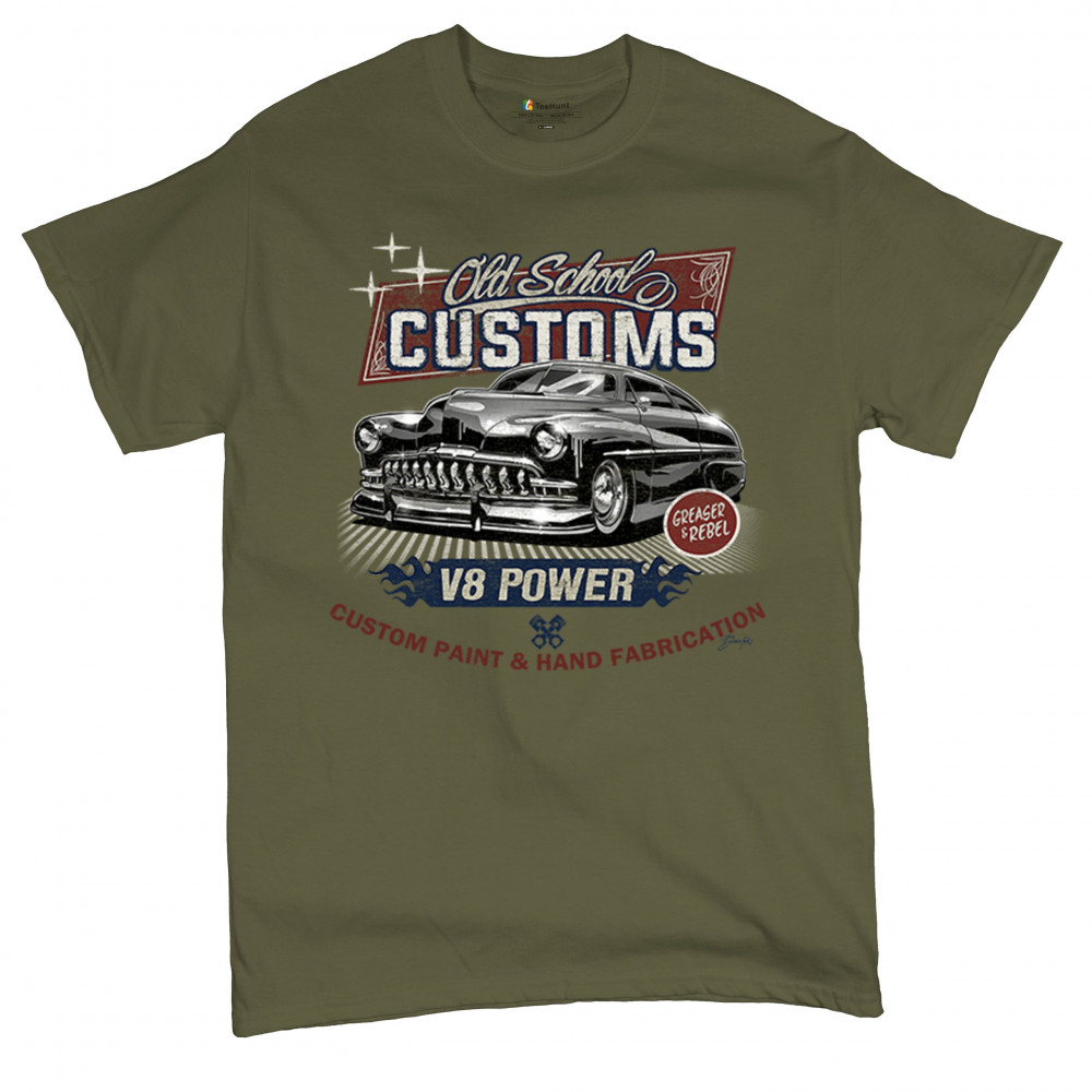 Celebrate classic automotive culture with our "Old School Customs" t-shirt, featuring a V8 power design. Perfect for car enthusiasts and fans of vintage rides.