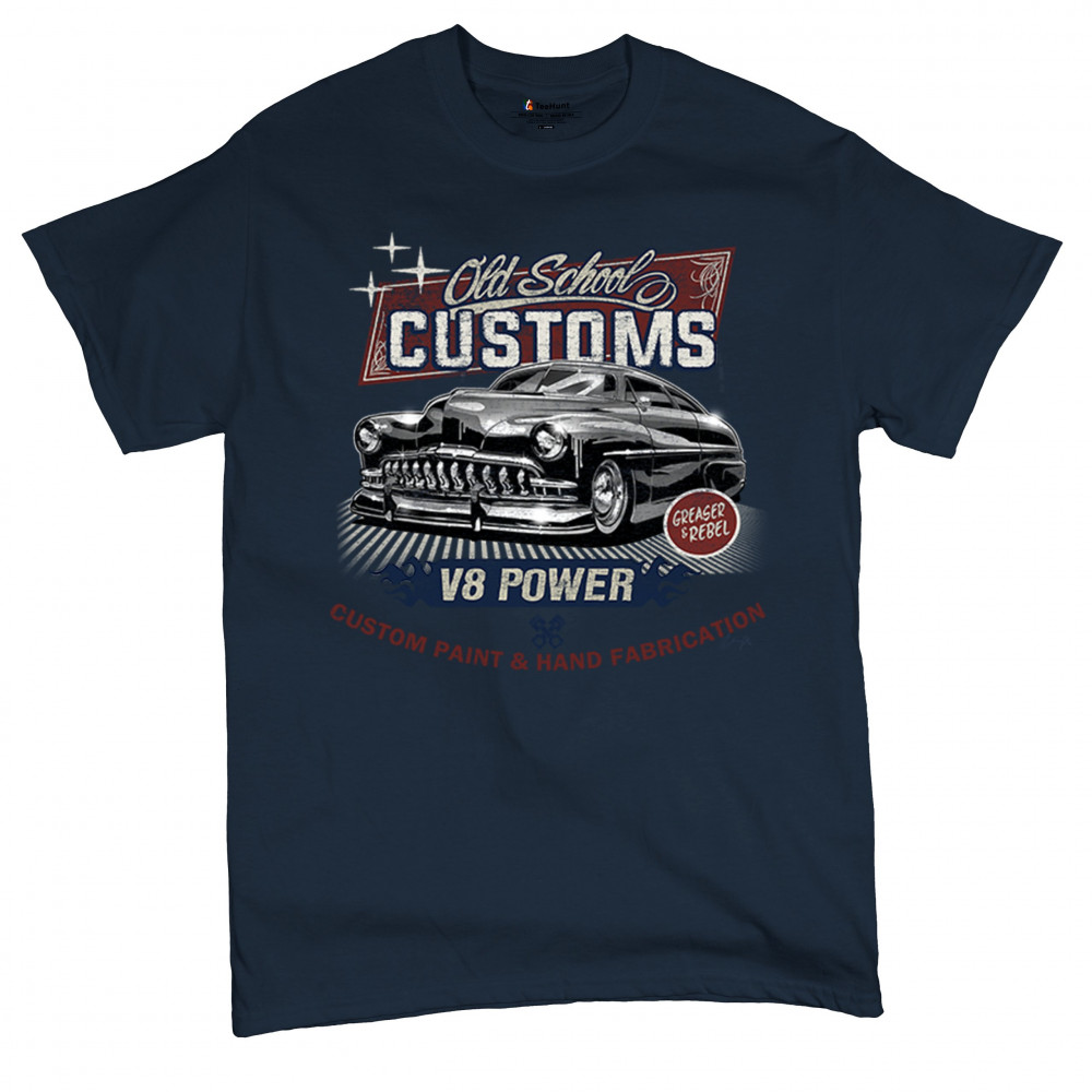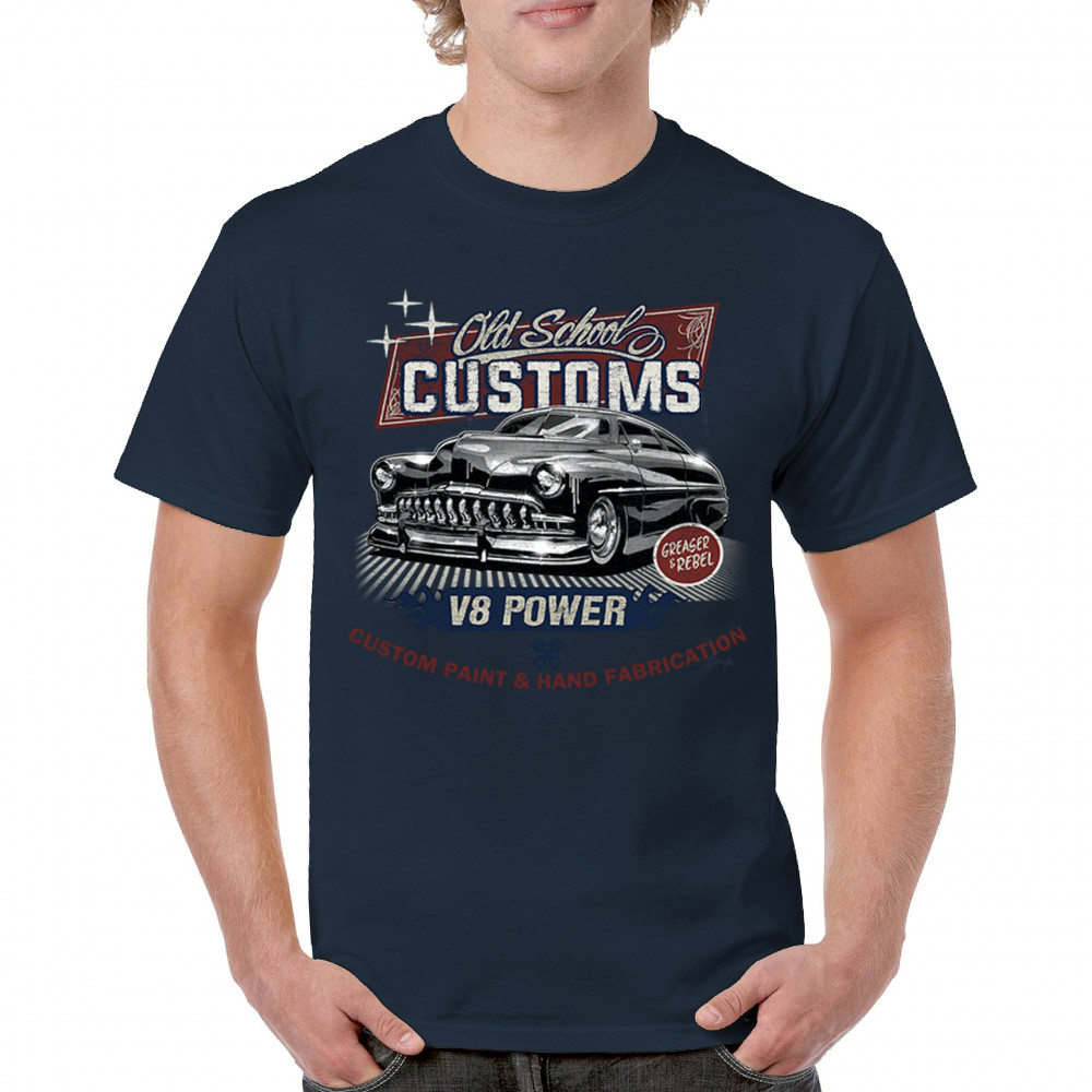 Celebrate classic automotive culture with our "Old School Customs" t-shirt, featuring a V8 power design. Perfect for car enthusiasts and fans of vintage rides.