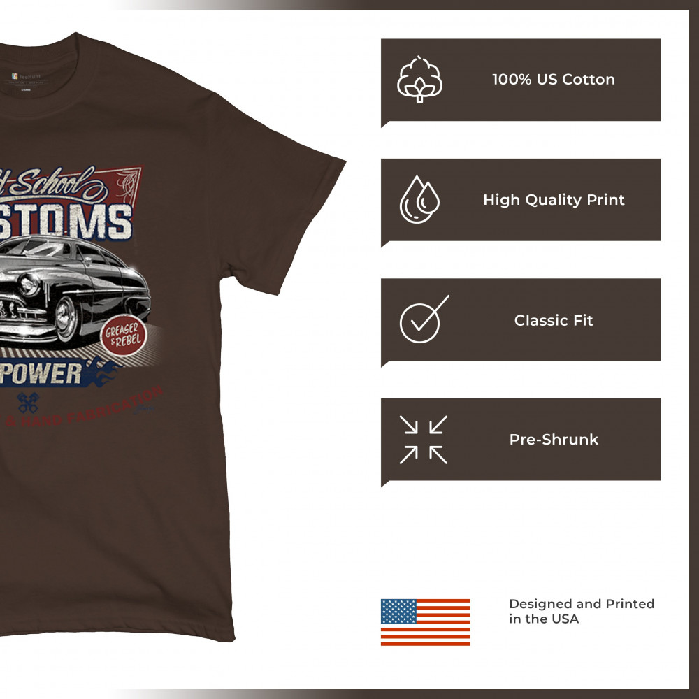 Step into the world of classic automotive culture with our "Old School Customs" t-shirt. Featuring a bold V8 power design, this shirt highlights the art of custom paint and hand fabrication. It's perfect for car enthusiasts, greasers, and rebels who appreciate the unique style of vintage rides. Made from high-quality materials, this tee offers comfort and durability, making it a great choice for car shows or casual outings. Show your love for old-school cars and stand out with this stylish and nostalgic piece. Add a touch of vintage charm to your wardrobe today.