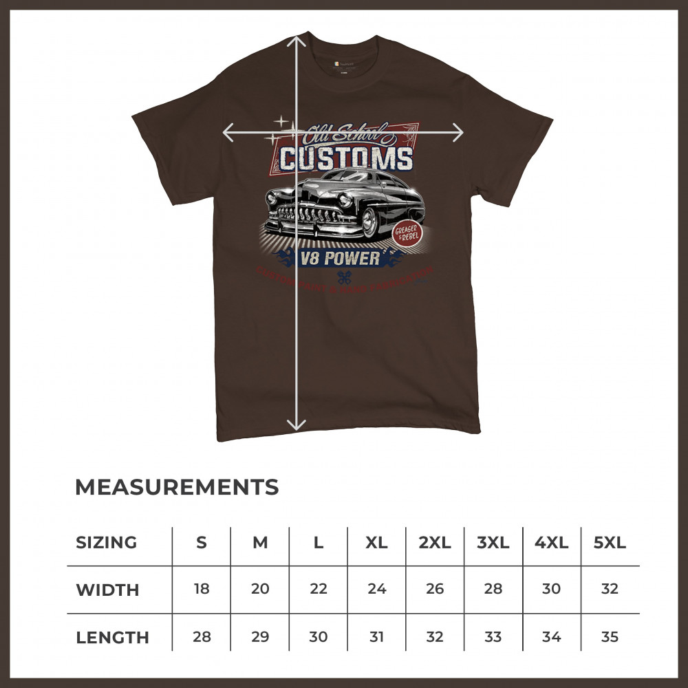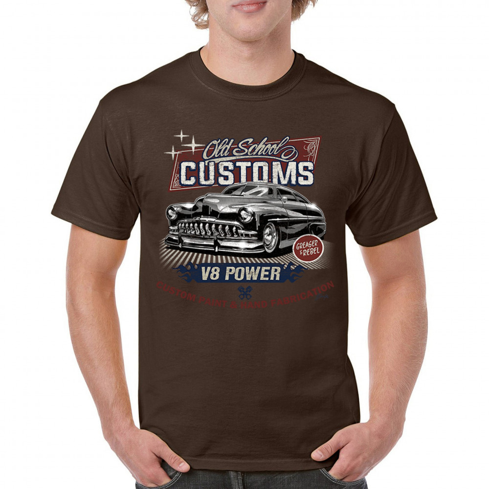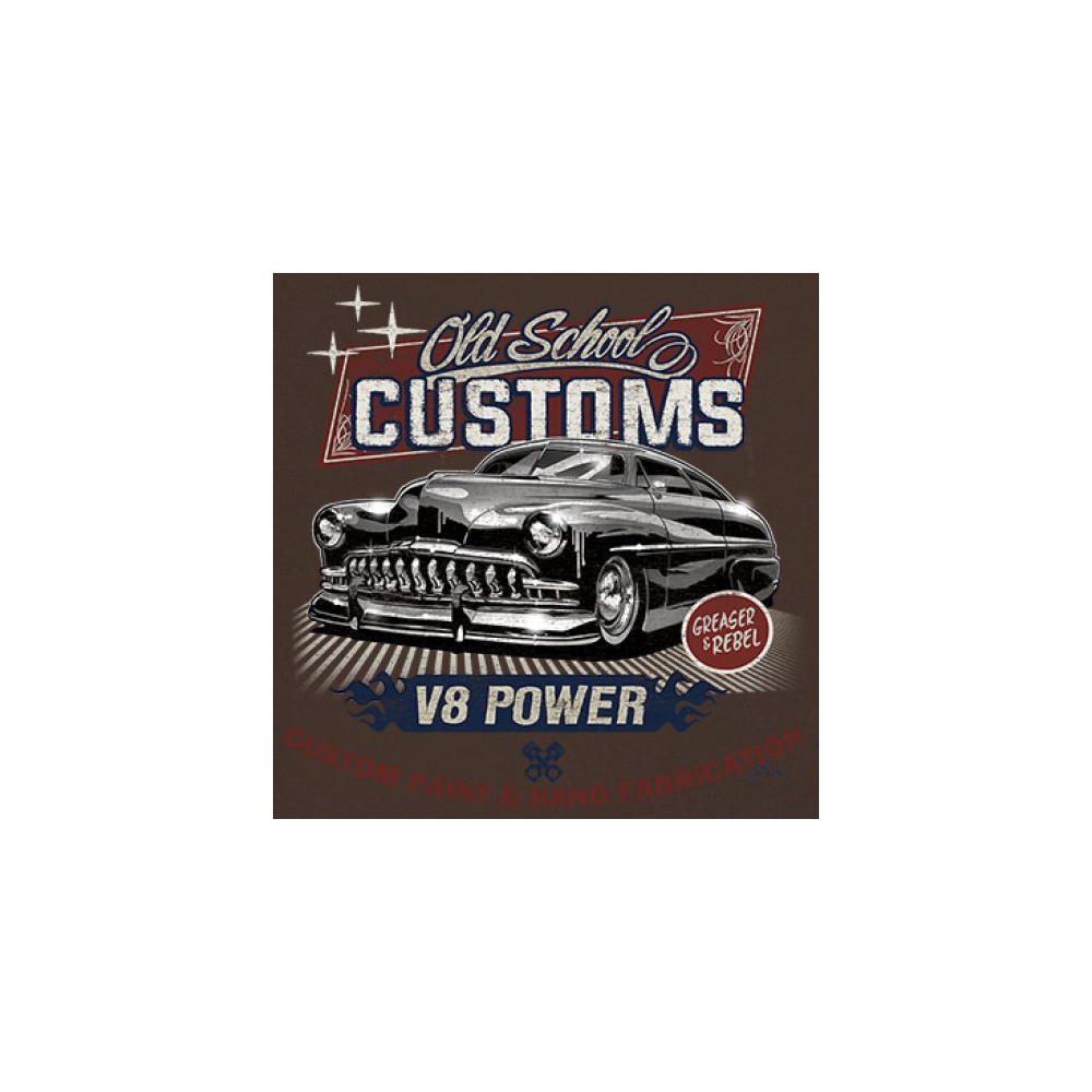 Celebrate classic automotive culture with our "Old School Customs" t-shirt, featuring a V8 power design. Perfect for car enthusiasts and fans of vintage rides.