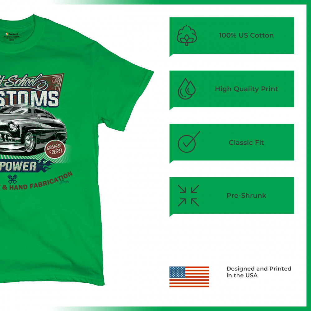 Step into the world of classic automotive culture with our "Old School Customs" t-shirt. Featuring a bold V8 power design, this shirt highlights the art of custom paint and hand fabrication. It's perfect for car enthusiasts, greasers, and rebels who appreciate the unique style of vintage rides. Made from high-quality materials, this tee offers comfort and durability, making it a great choice for car shows or casual outings. Show your love for old-school cars and stand out with this stylish and nostalgic piece. Add a touch of vintage charm to your wardrobe today.