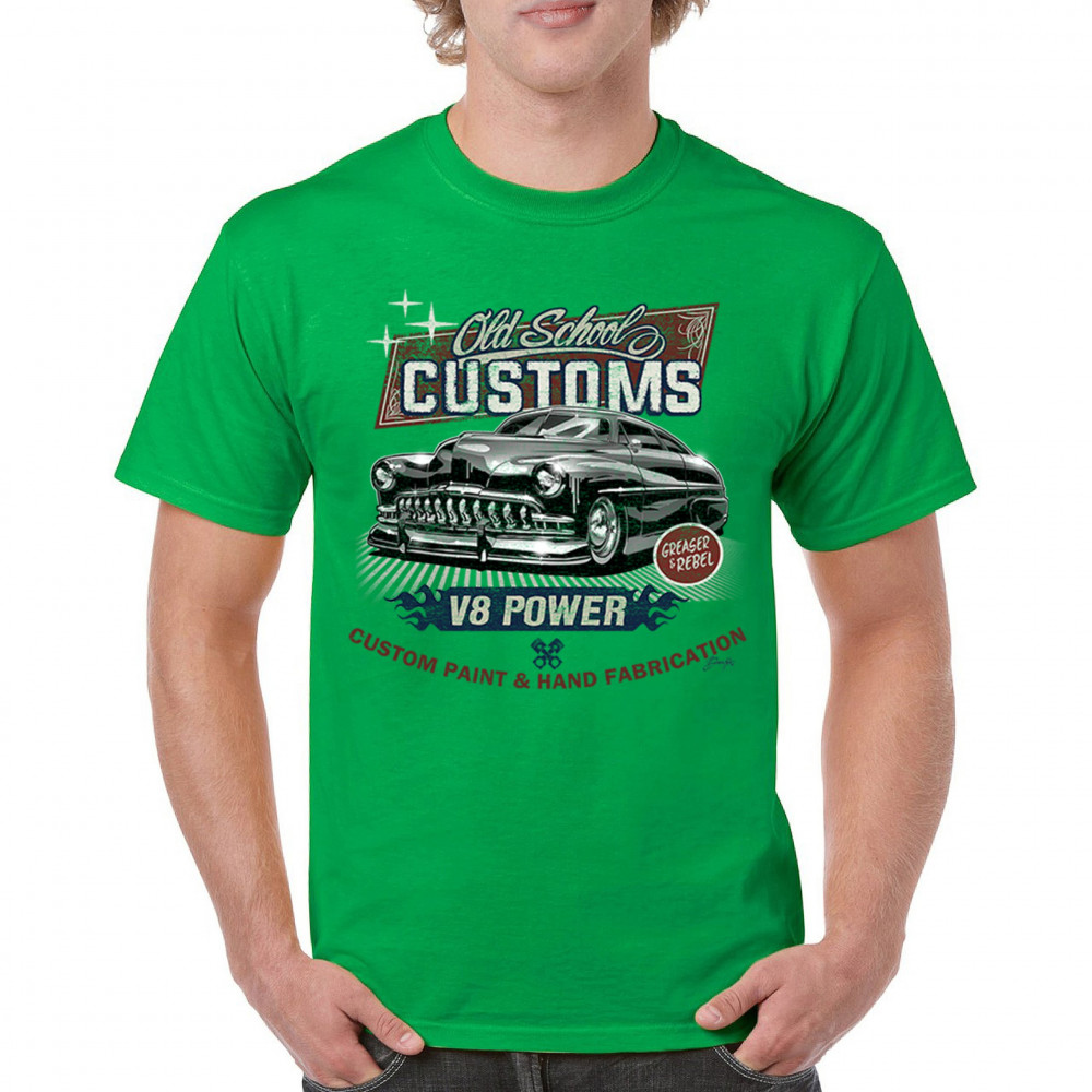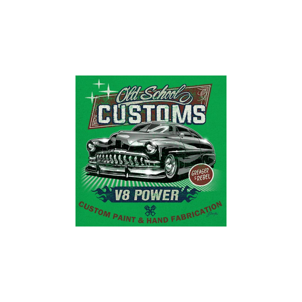 Celebrate classic automotive culture with our "Old School Customs" t-shirt, featuring a V8 power design. Perfect for car enthusiasts and fans of vintage rides.