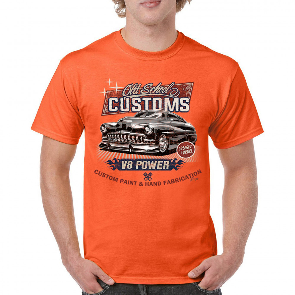 Celebrate classic automotive culture with our "Old School Customs" t-shirt, featuring a V8 power design. Perfect for car enthusiasts and fans of vintage rides.