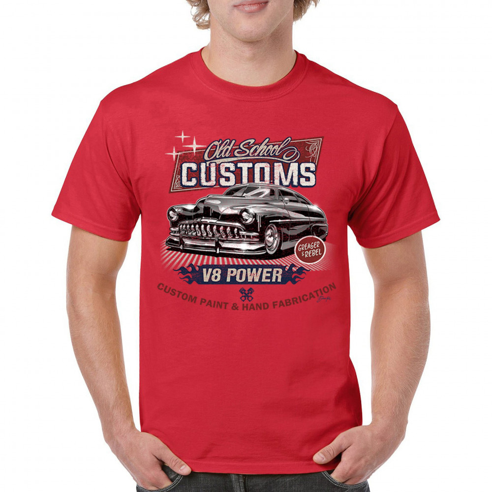 Celebrate classic automotive culture with our "Old School Customs" t-shirt, featuring a V8 power design. Perfect for car enthusiasts and fans of vintage rides.