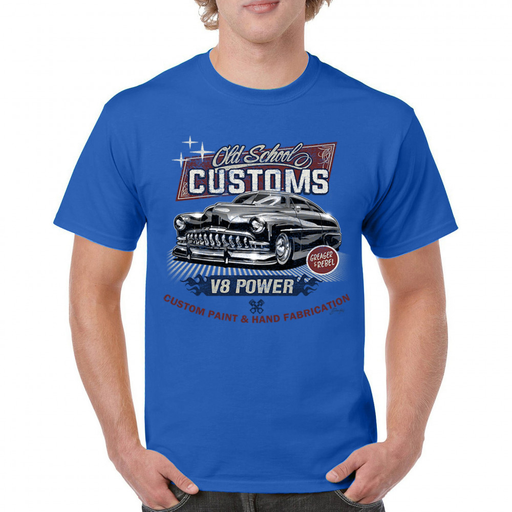 Celebrate classic automotive culture with our "Old School Customs" t-shirt, featuring a V8 power design. Perfect for car enthusiasts and fans of vintage rides.