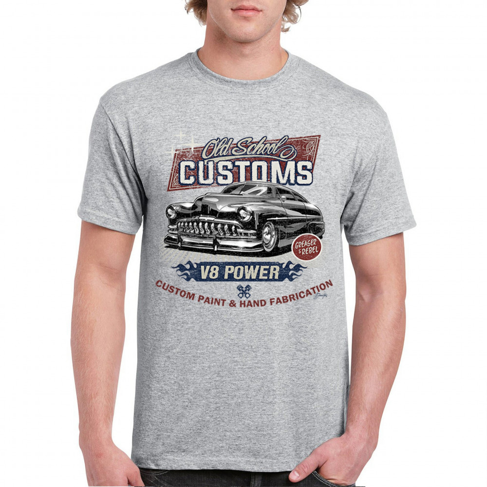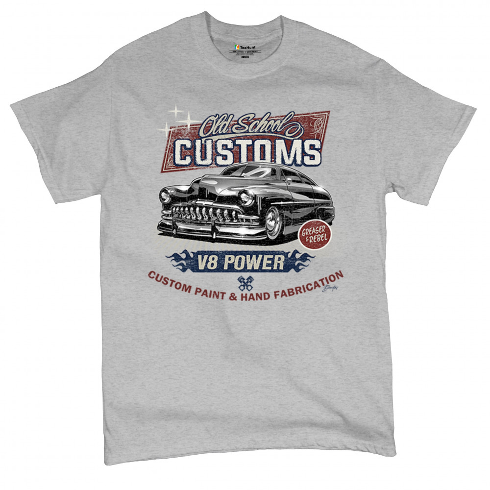 Celebrate classic automotive culture with our "Old School Customs" t-shirt, featuring a V8 power design. Perfect for car enthusiasts and fans of vintage rides.