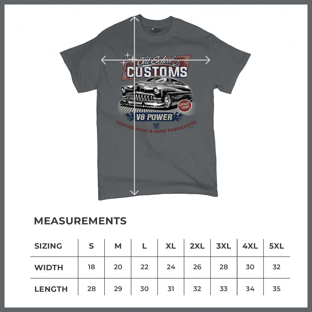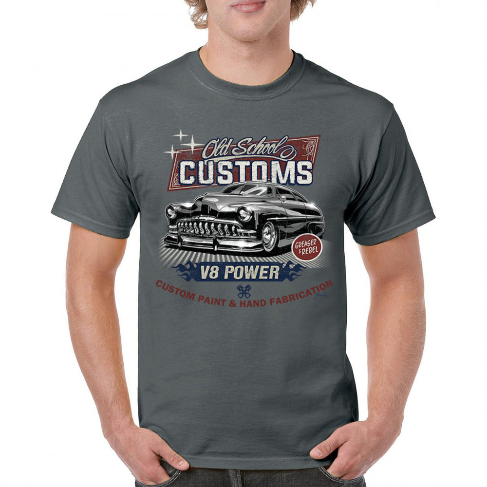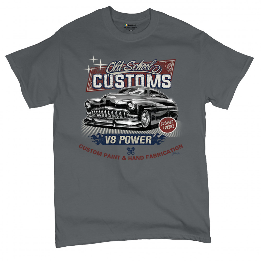 Celebrate classic automotive culture with our "Old School Customs" t-shirt, featuring a V8 power design. Perfect for car enthusiasts and fans of vintage rides.
