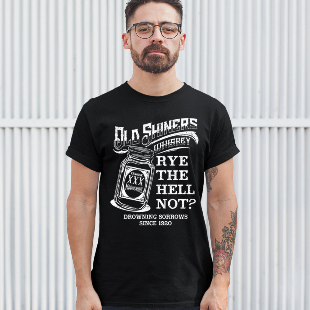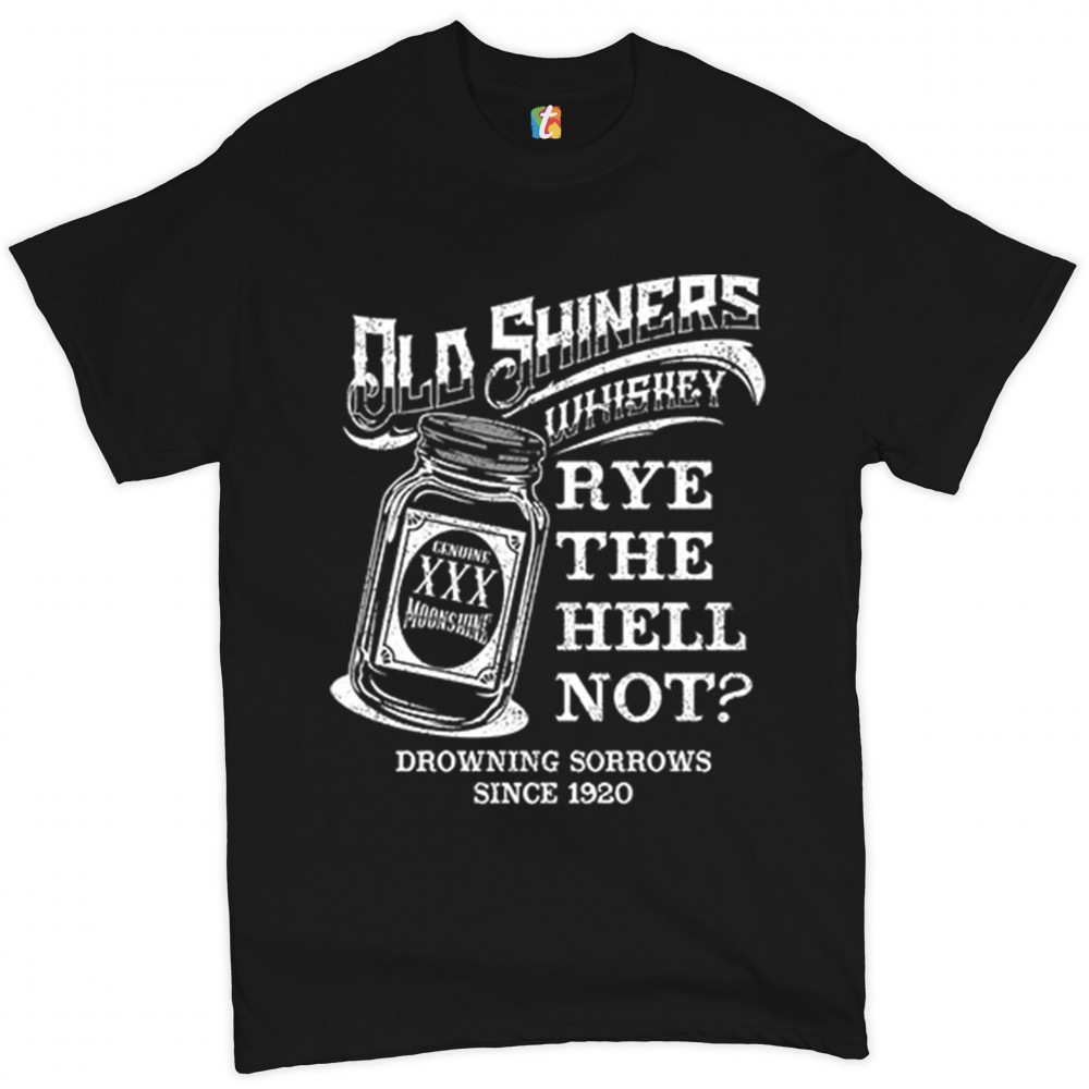 OLD SHINERS WHISKEY t-shirt rye the hell not? old school drinking men's tee black