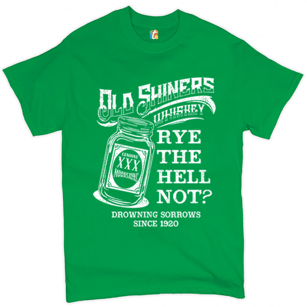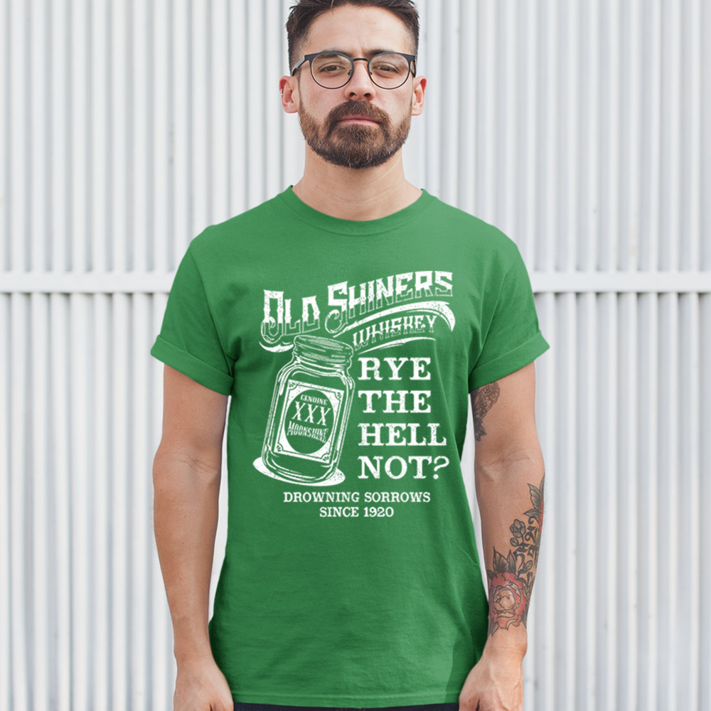 A funny print featuring a mason jar with a label that says: "Genuine XXX Moonshine". The print also says: "Old Shiners Whiskey, Rye the Hell Not? Drowning Sorrows Since 1920". A great choice for an old school person who doesn't mind a glass or two.
