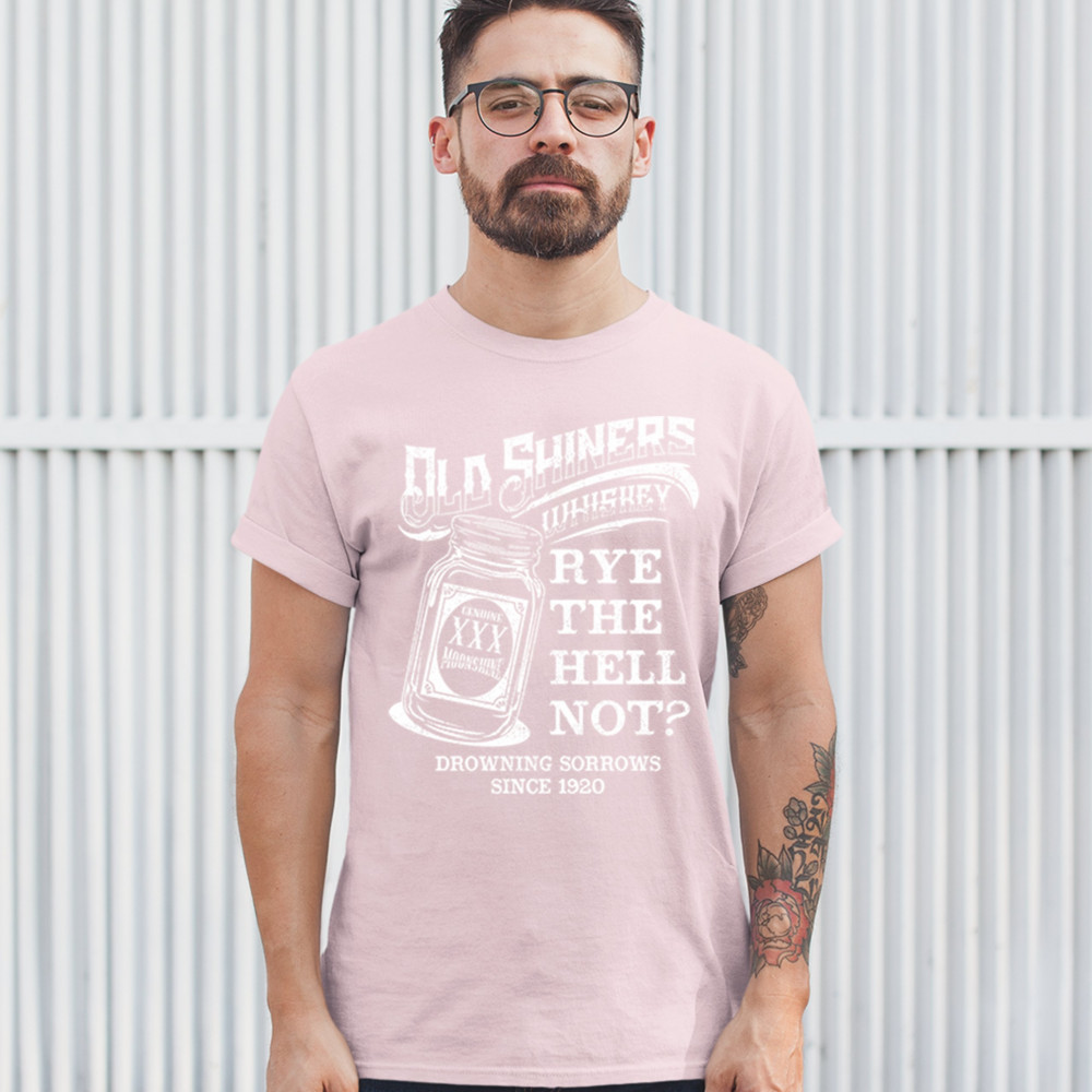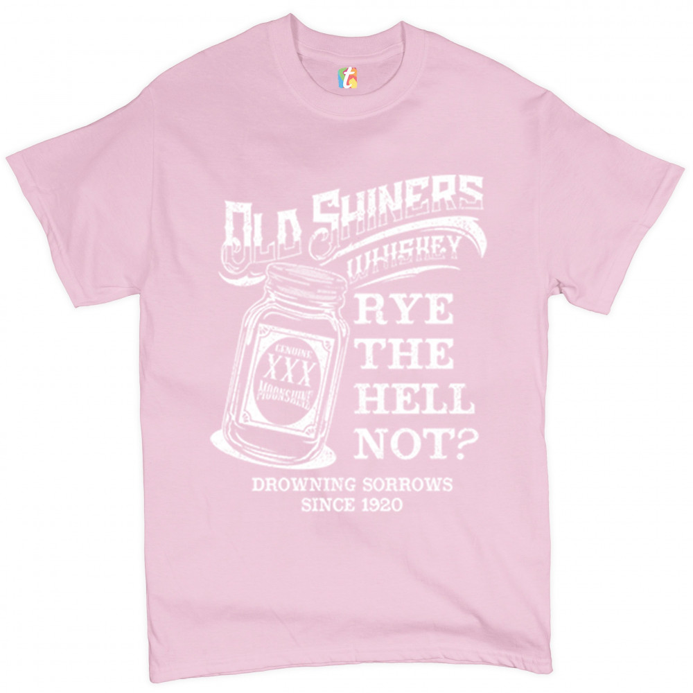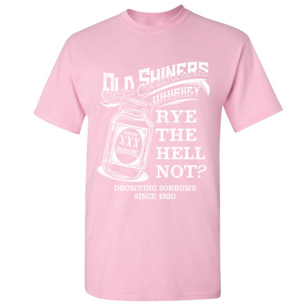 OLD SHINERS WHISKEY t-shirt rye the hell not? old school drinking men's tee light pink
