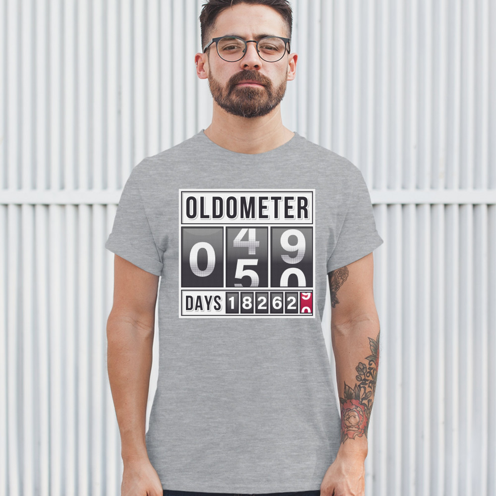 A funny print featuring an odometer called an "Oldometer" which measures years and days instead of miles. The odometer reads 18262 days or almost 50 years of "age". A great choice for anyone with a great sense of humor and self awareness.