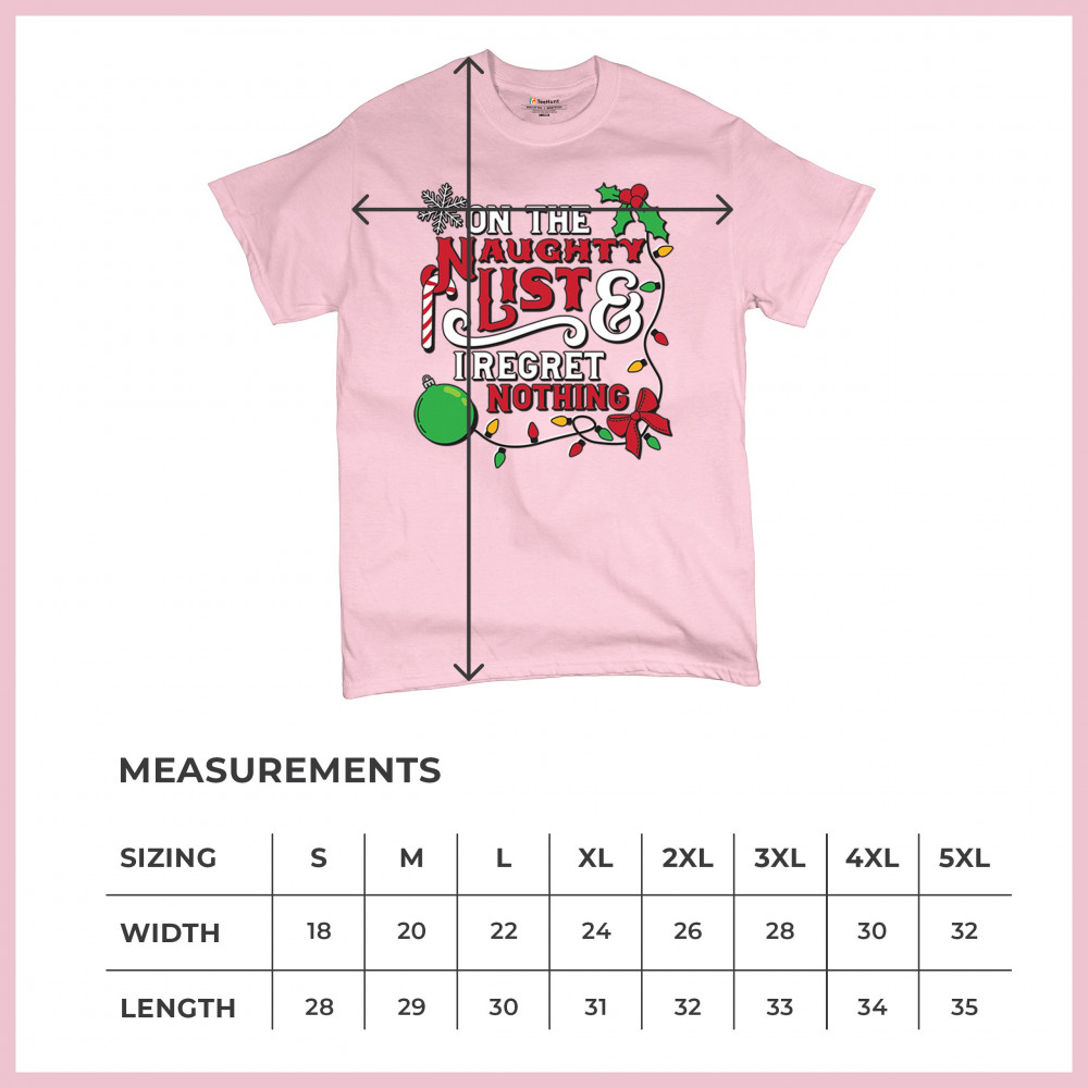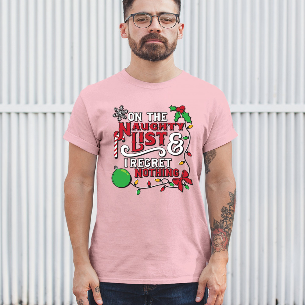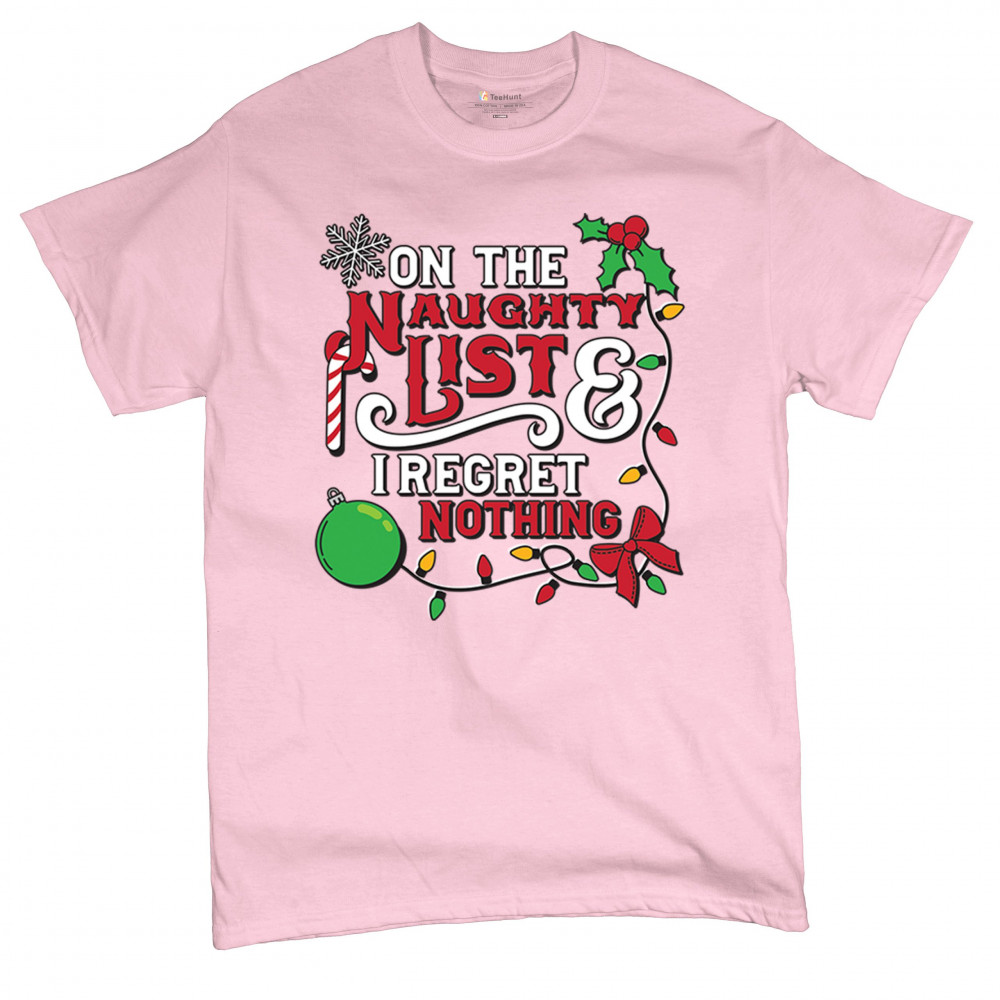 Celebrate the holidays with the playful “Naughty List & I Regret Nothing†design. Perfect for festive gatherings, ugly sweater parties, and holiday fun!