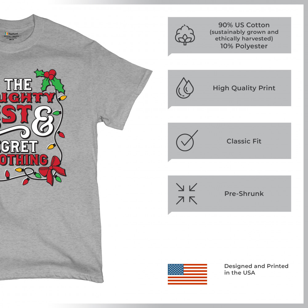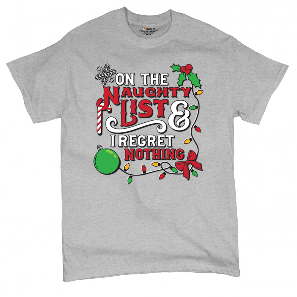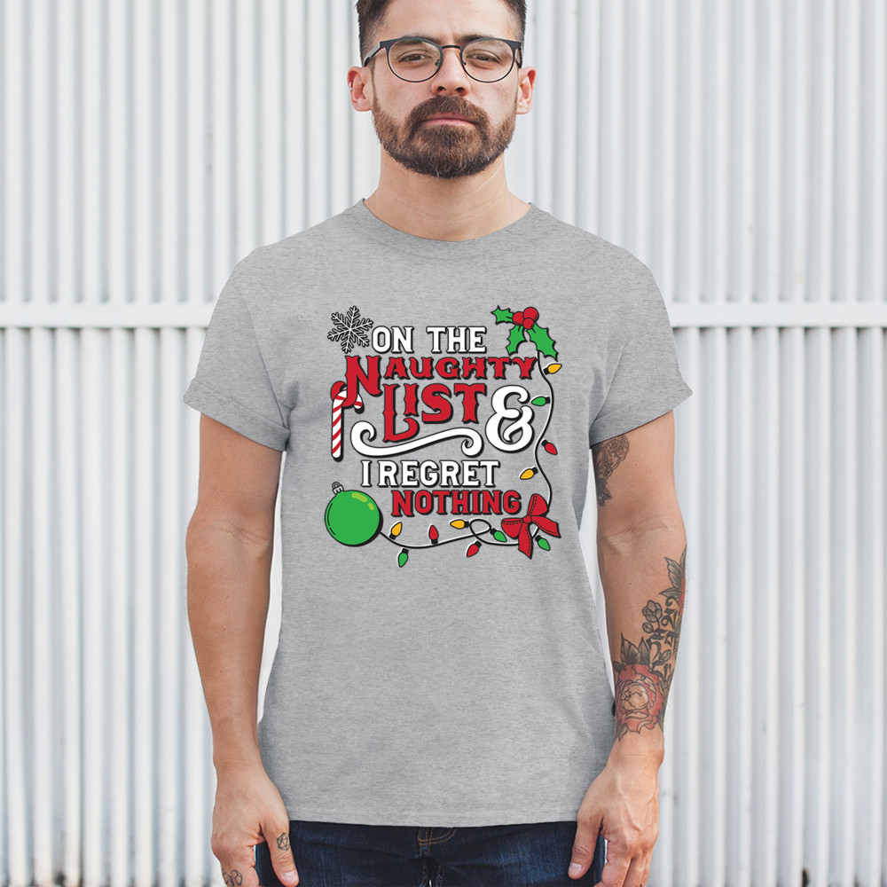 Express your holiday spirit with humor through the "Naughty List & I Regret Nothing" design, a perfect companion for Christmas celebrations, gift exchanges, or festive family gatherings. It adds a touch of playfulness to your winter wardrobe while spreading joy and laughter. Ideal for pairing with an ugly sweater or cozy holiday apparel, it’s the ultimate way to stay jolly and carefree throughout the season.