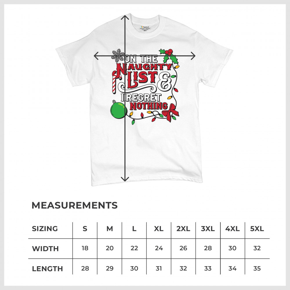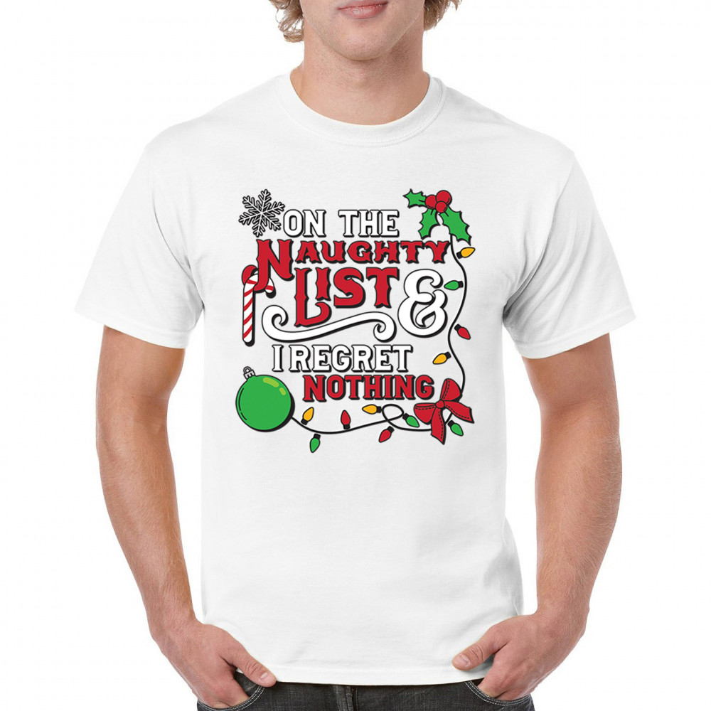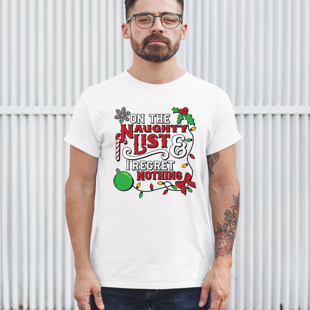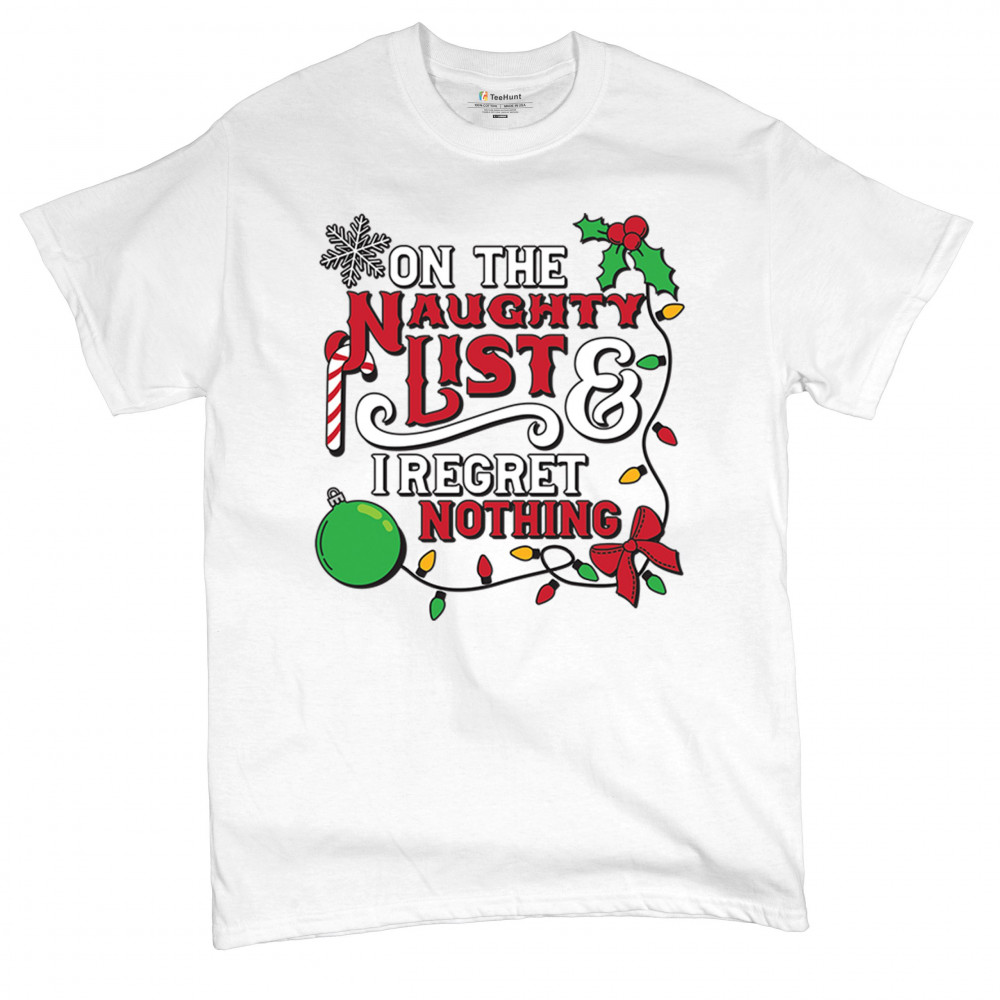 Celebrate the holidays with the playful “Naughty List & I Regret Nothing†design. Perfect for festive gatherings, ugly sweater parties, and holiday fun!