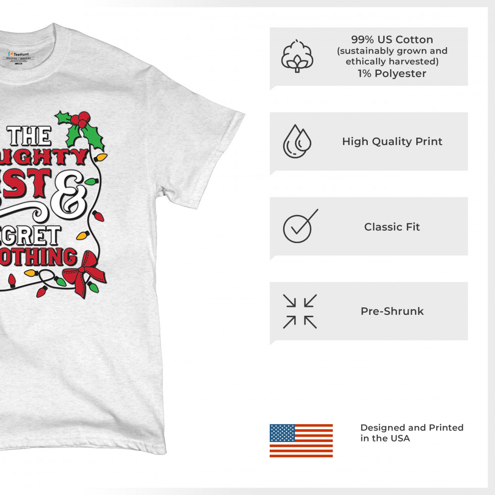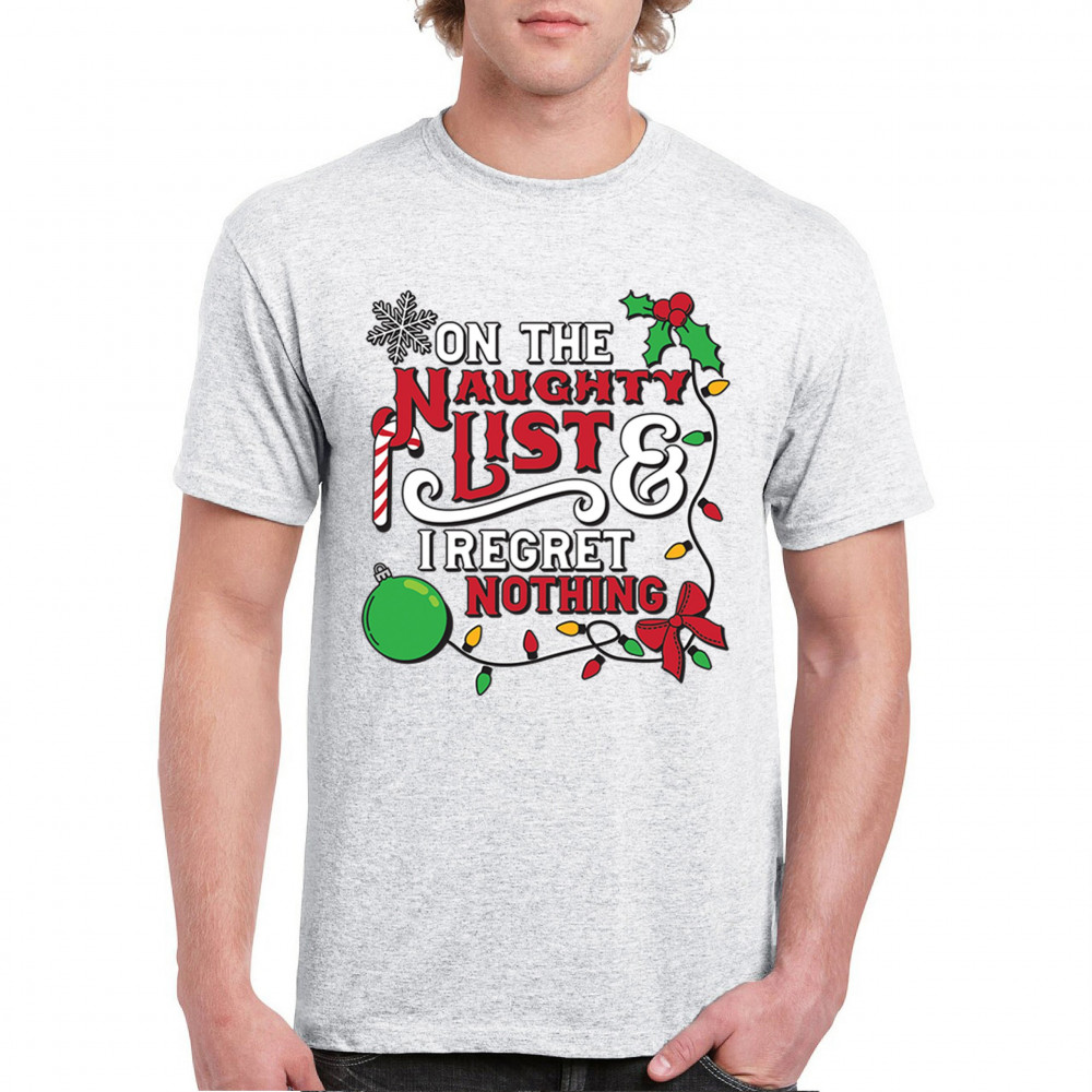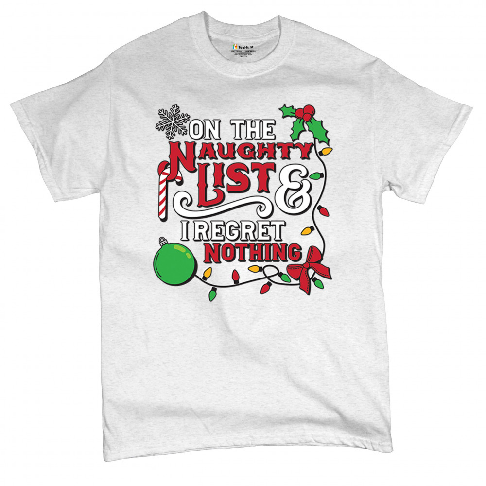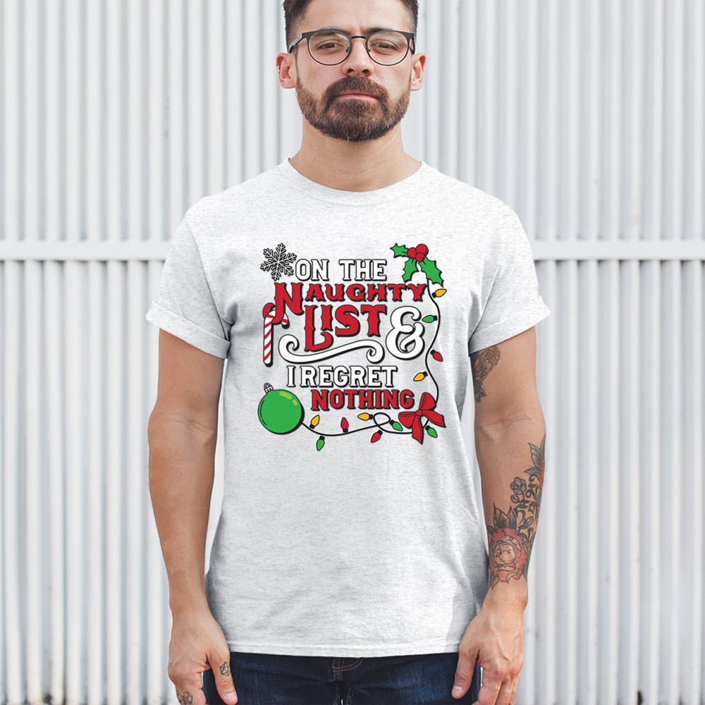 Express your holiday spirit with humor through the "Naughty List & I Regret Nothing" design, a perfect companion for Christmas celebrations, gift exchanges, or festive family gatherings. It adds a touch of playfulness to your winter wardrobe while spreading joy and laughter. Ideal for pairing with an ugly sweater or cozy holiday apparel, it’s the ultimate way to stay jolly and carefree throughout the season.