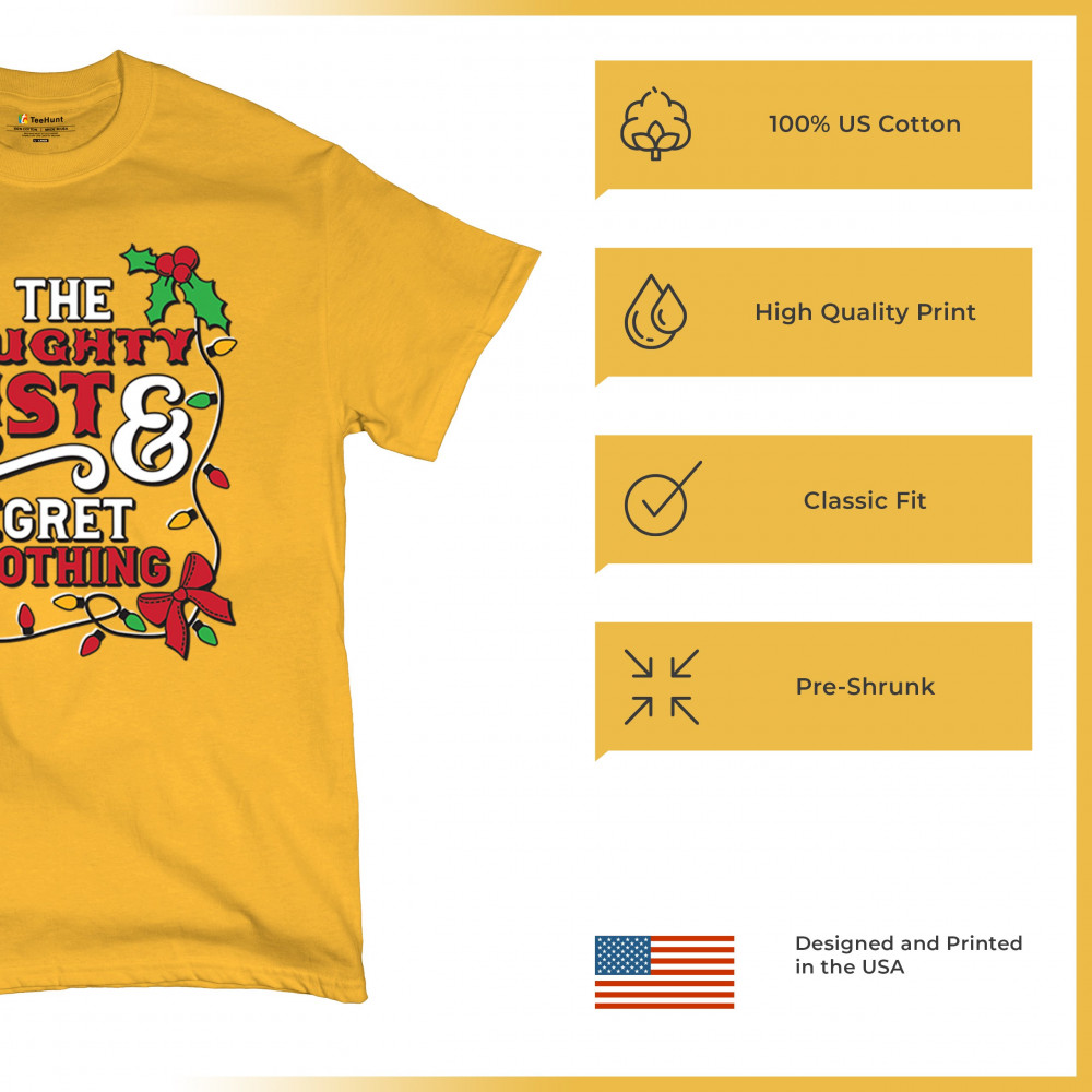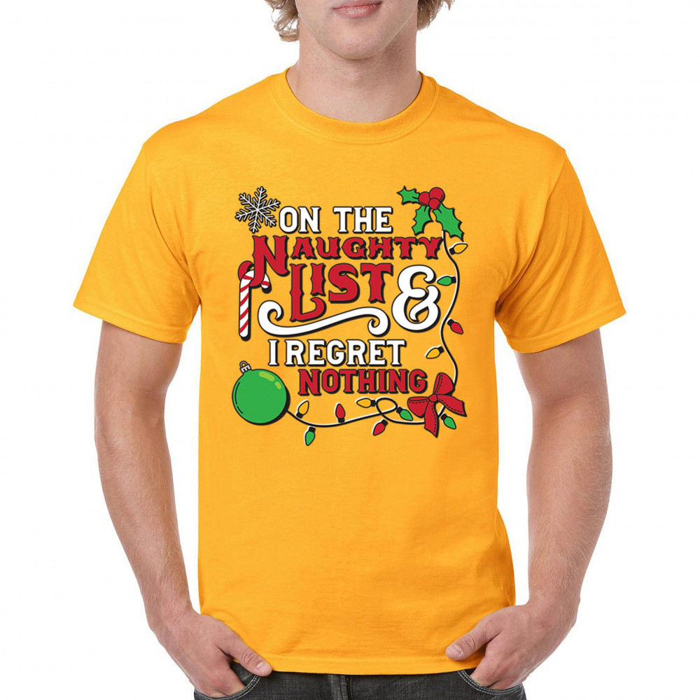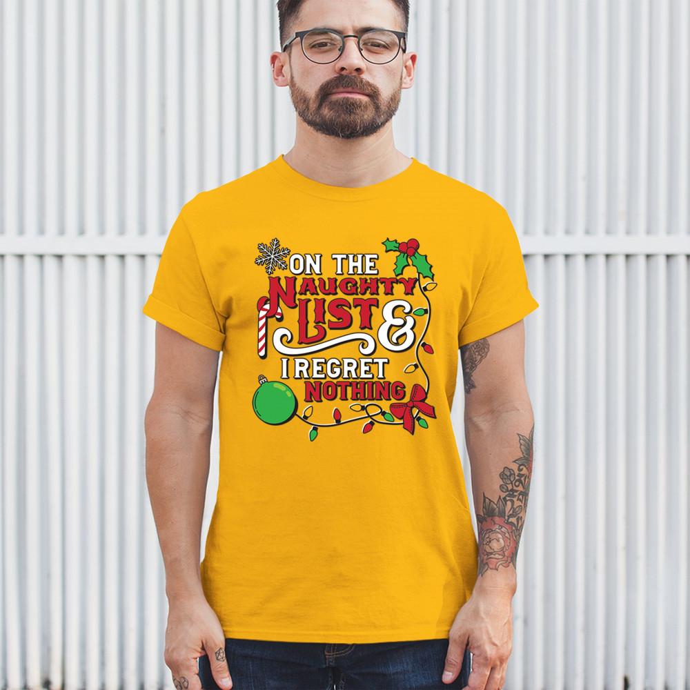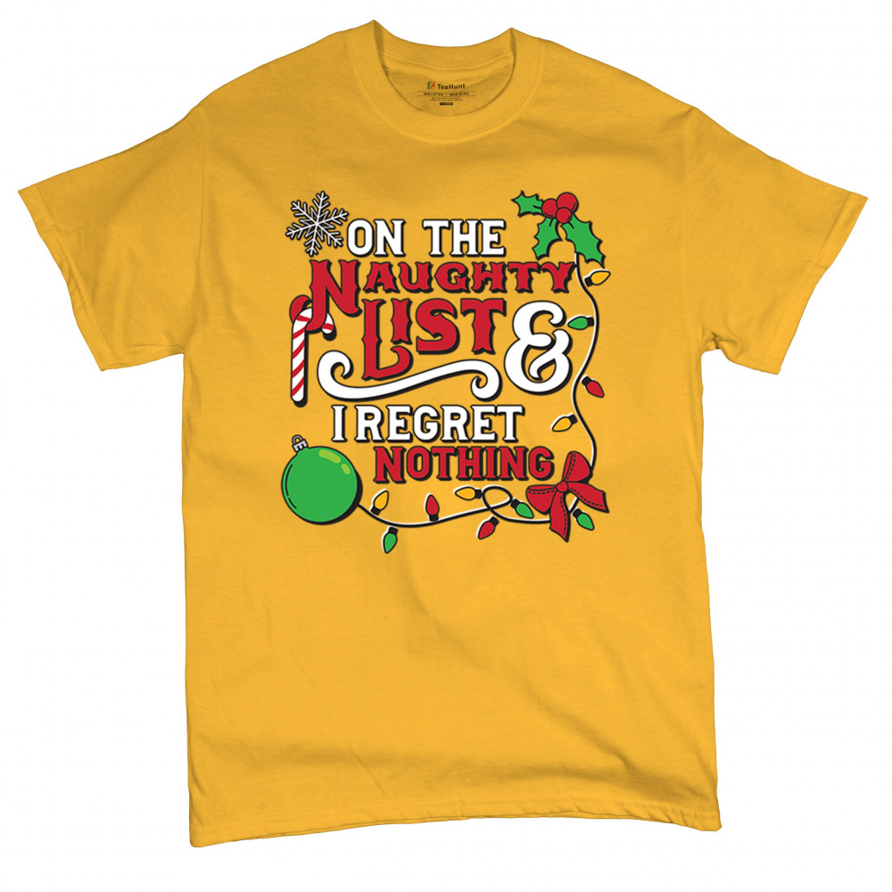Express your holiday spirit with humor through the "Naughty List & I Regret Nothing" design, a perfect companion for Christmas celebrations, gift exchanges, or festive family gatherings. It adds a touch of playfulness to your winter wardrobe while spreading joy and laughter. Ideal for pairing with an ugly sweater or cozy holiday apparel, it’s the ultimate way to stay jolly and carefree throughout the season.