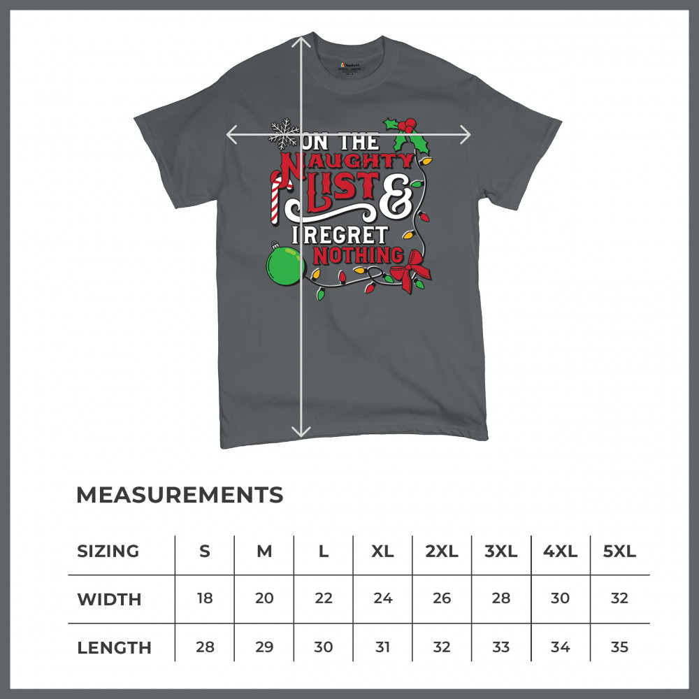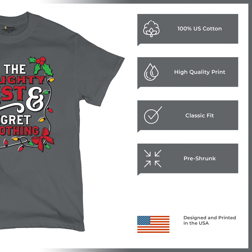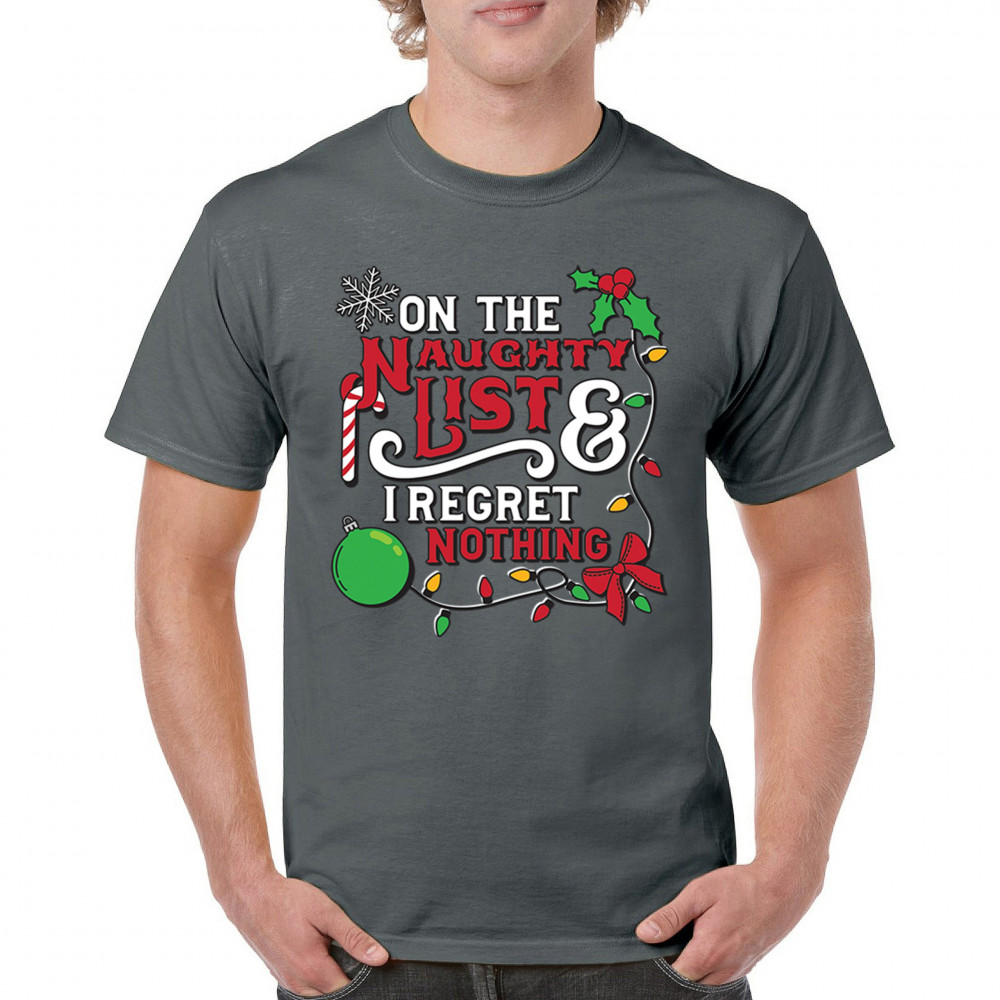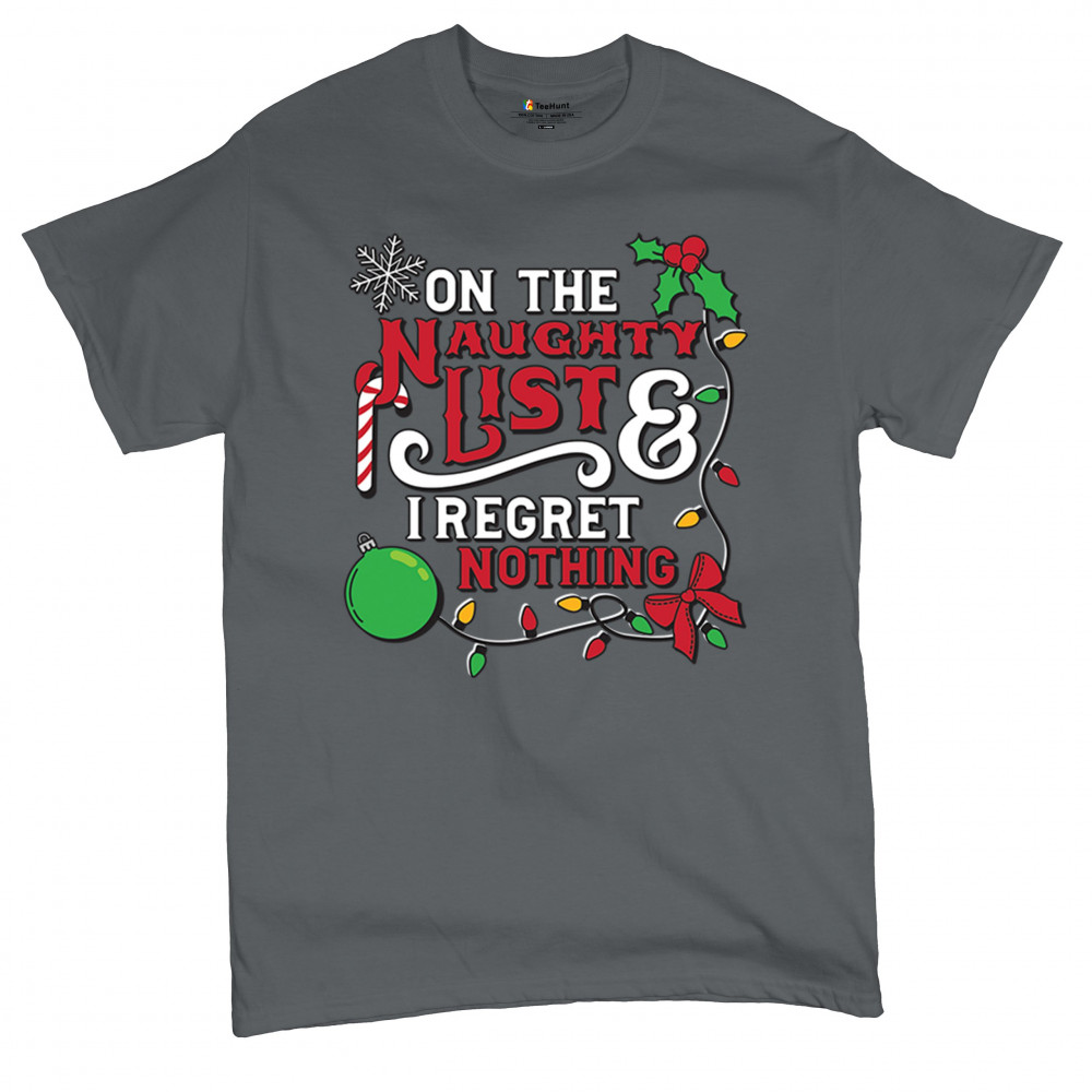 Celebrate the holidays with the playful “Naughty List & I Regret Nothing†design. Perfect for festive gatherings, ugly sweater parties, and holiday fun!