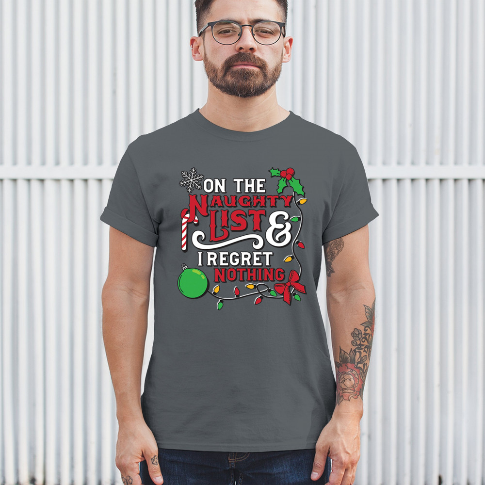 Express your holiday spirit with humor through the "Naughty List & I Regret Nothing" design, a perfect companion for Christmas celebrations, gift exchanges, or festive family gatherings. It adds a touch of playfulness to your winter wardrobe while spreading joy and laughter. Ideal for pairing with an ugly sweater or cozy holiday apparel, it’s the ultimate way to stay jolly and carefree throughout the season.