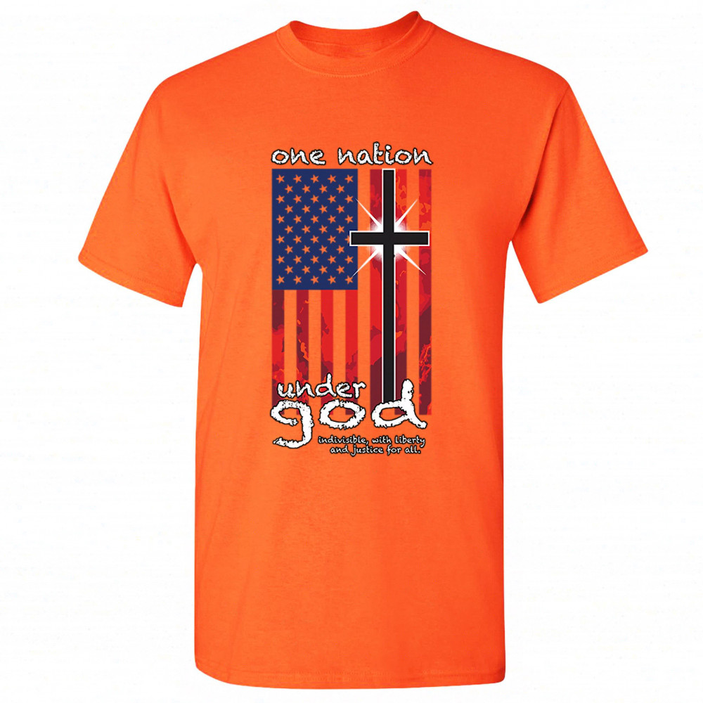 A patriotic print saying "One Nation Under God Indivisible, with Liberty and Justice for All" and featuring an American Flag with a cross instead of one of the stripes. Great choice for a religious person to wear on Independence Day or any other patriotic