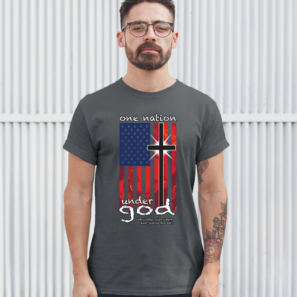 A patriotic print saying "One Nation Under God Indivisible, with Liberty and Justice for All" and featuring an American Flag with a cross instead of one of the stripes. Great choice for a religious person to wear on Independence Day or any other patriotic