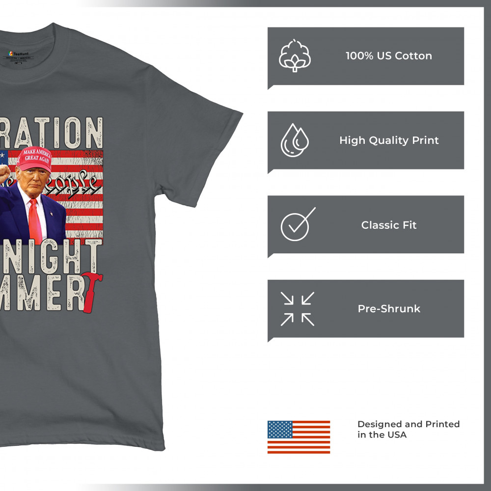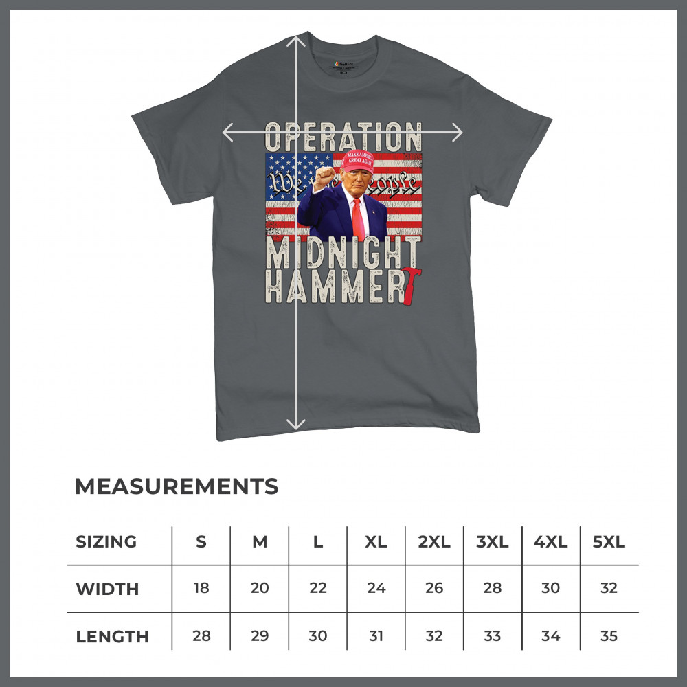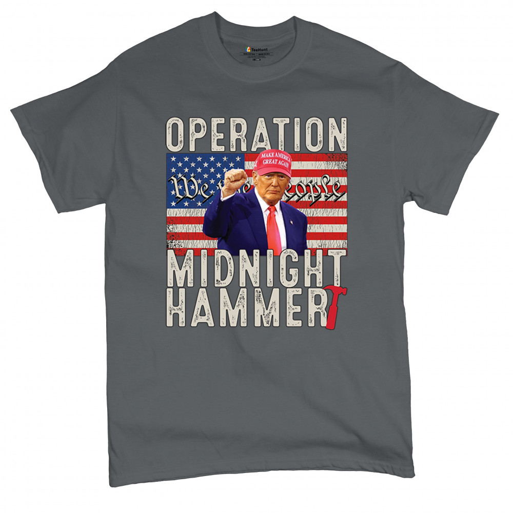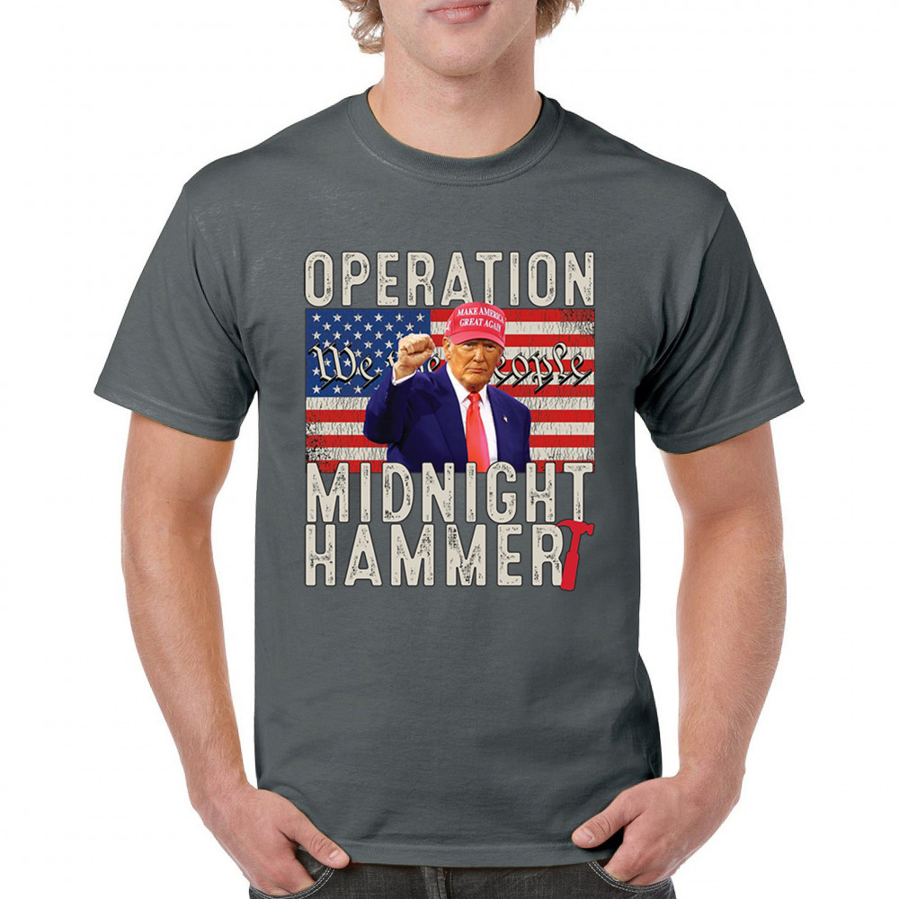 Operation Midnight Hammer is a bold, pro-America design featuring a presidential figure, hammer symbolism, and USA flag. For those who believe in America First, military strength, and Republican values. Worn by patriots who stand for freedom, leadership, and unwavering national pride.