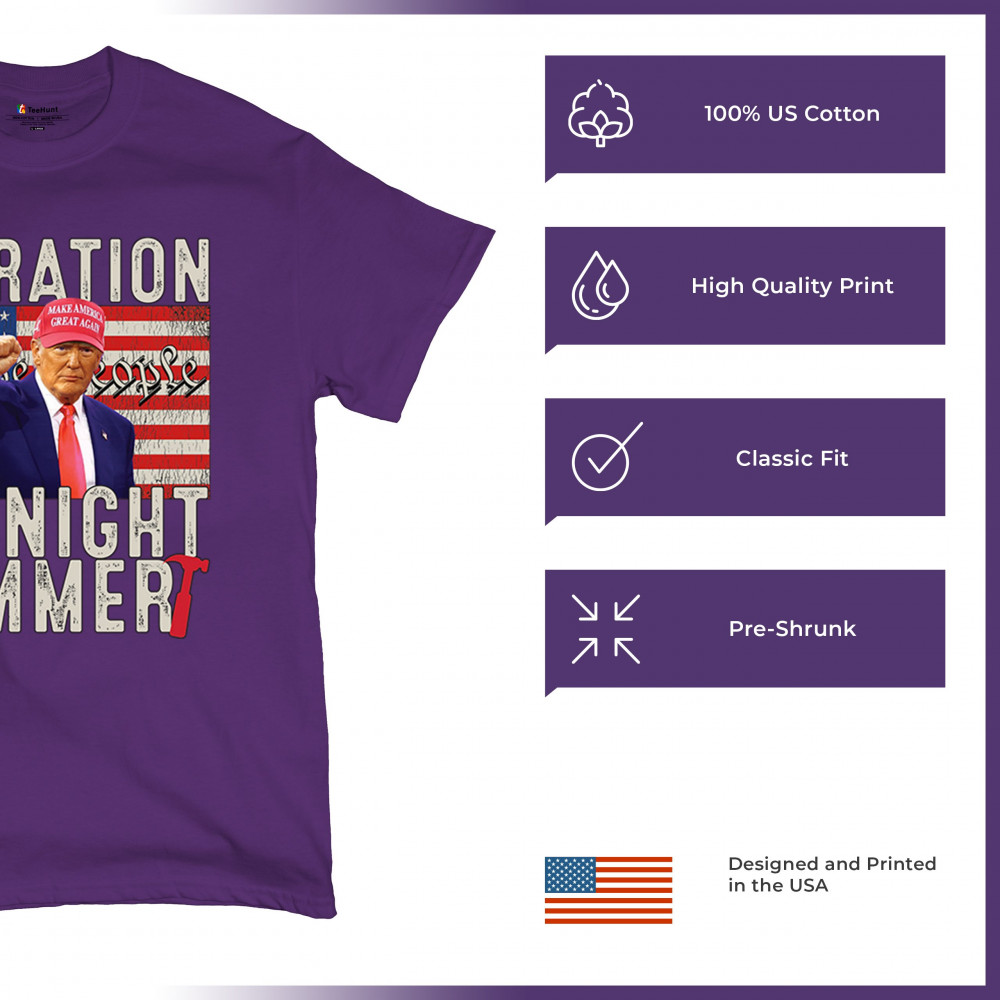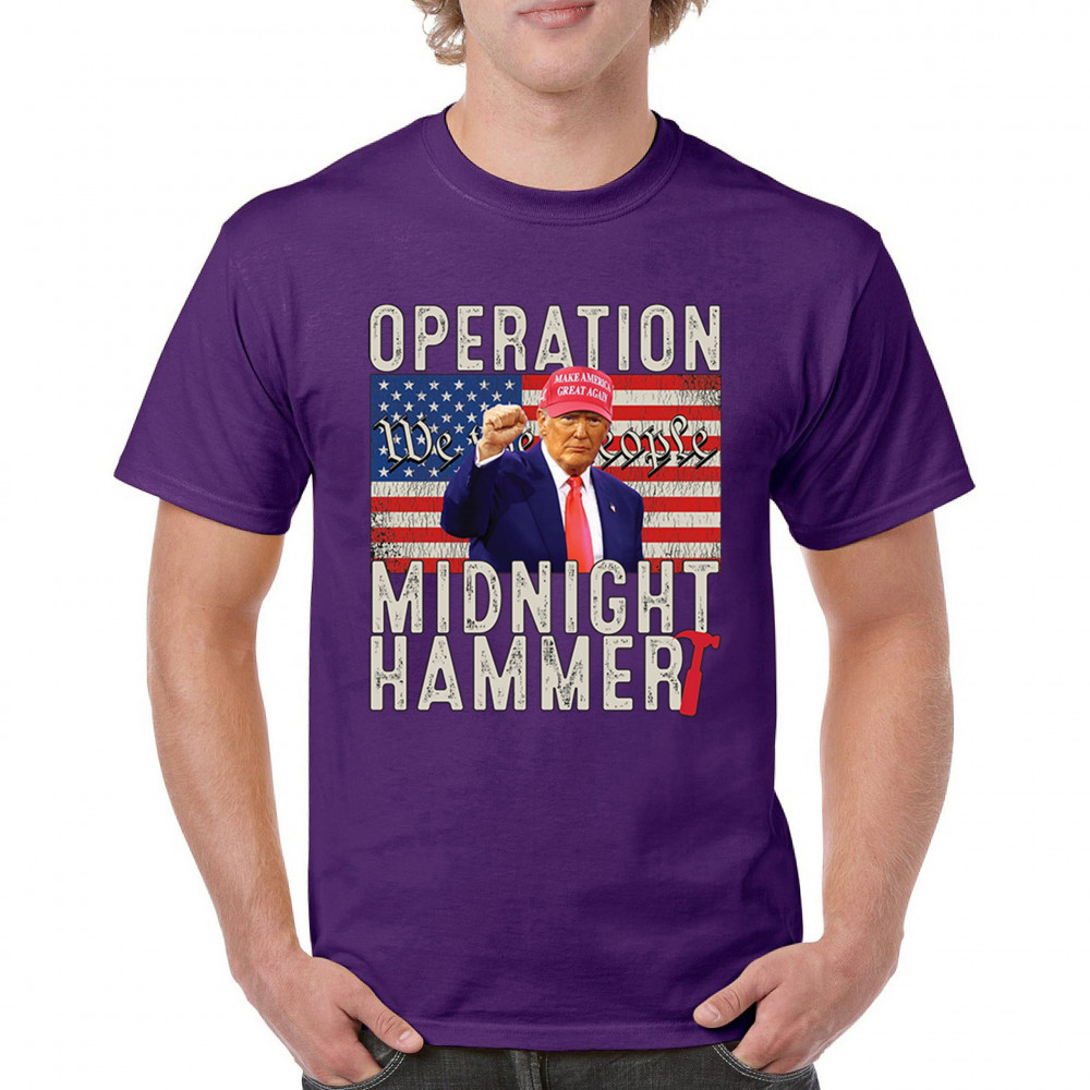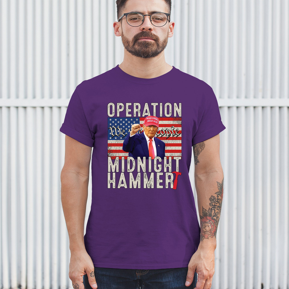 Operation Midnight Hammer is a bold, pro-America design featuring a presidential figure, hammer symbolism, and USA flag. For those who believe in America First, military strength, and Republican values. Worn by patriots who stand for freedom, leadership, and unwavering national pride.