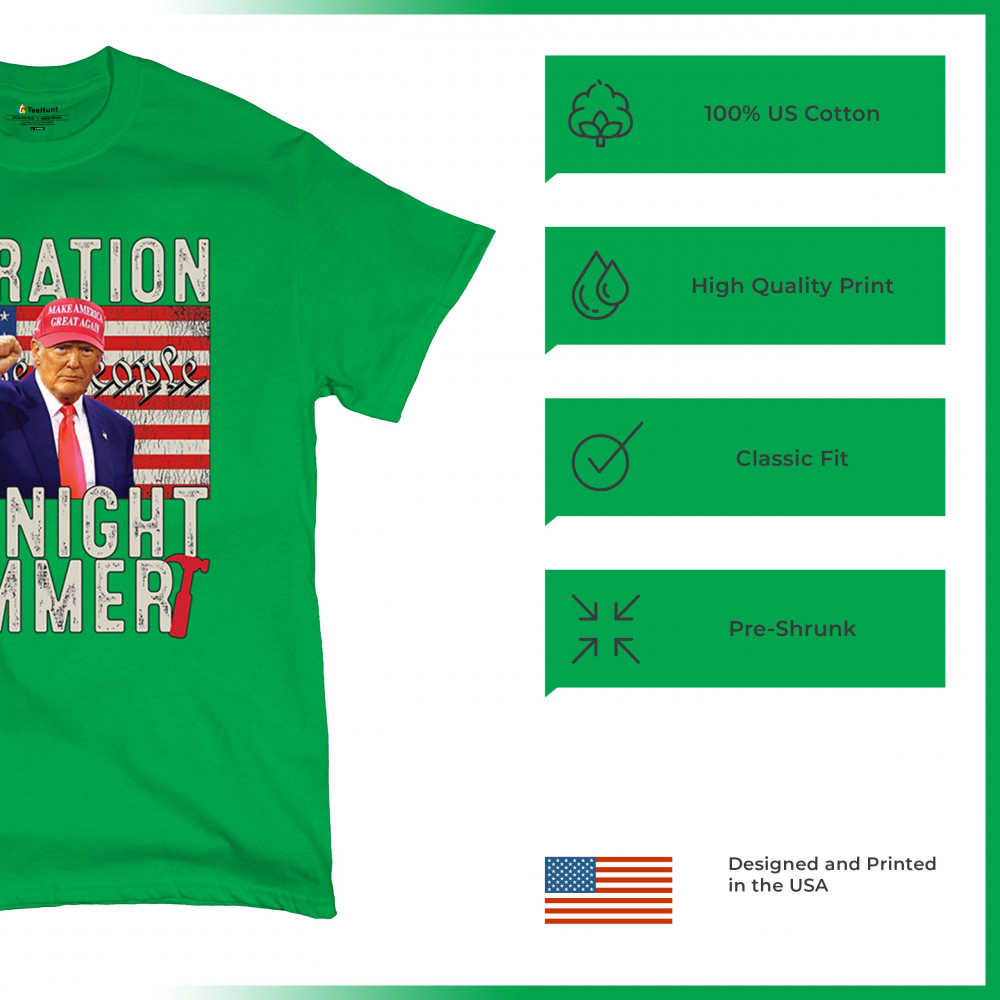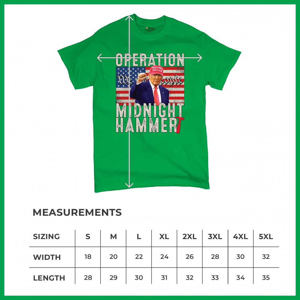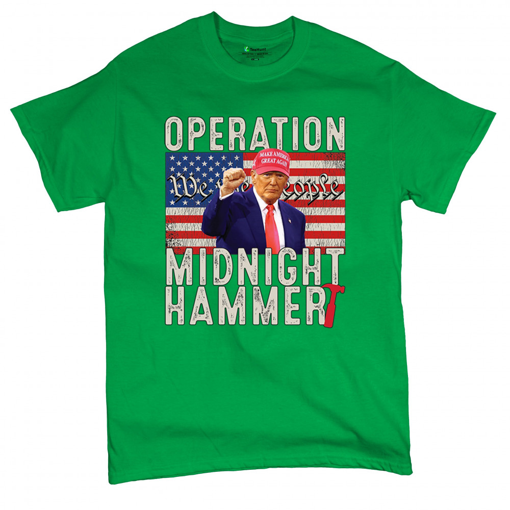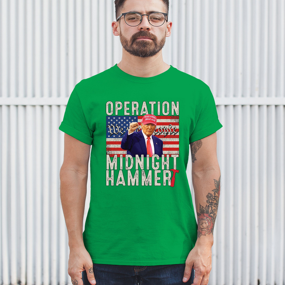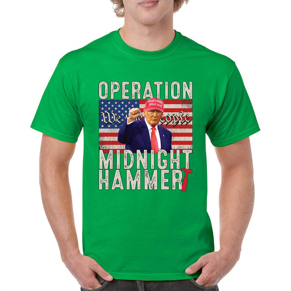Operation Midnight Hammer is a bold, pro-America design featuring a presidential figure, hammer symbolism, and USA flag. For those who believe in America First, military strength, and Republican values. Worn by patriots who stand for freedom, leadership, and unwavering national pride.
