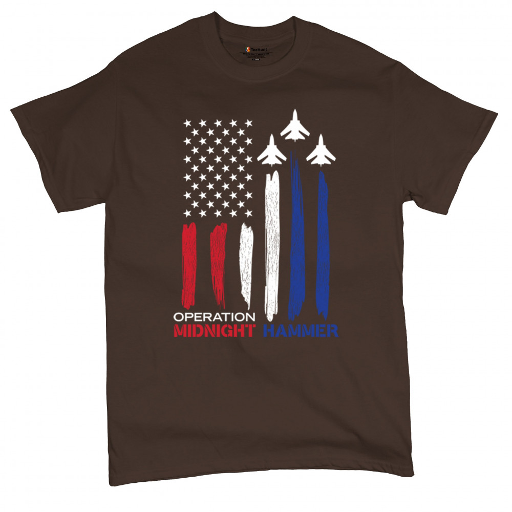 Operation Midnight Hammer design with jets and patriotic flag. Perfect for military pride, conservatives, and true America First supporters.