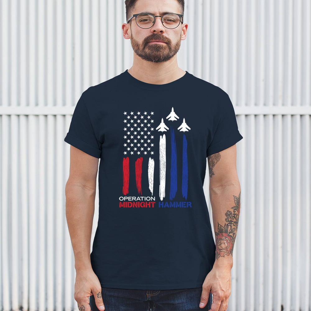 Operation Midnight Hammer design with jets and patriotic flag. Perfect for military pride, conservatives, and true America First supporters.