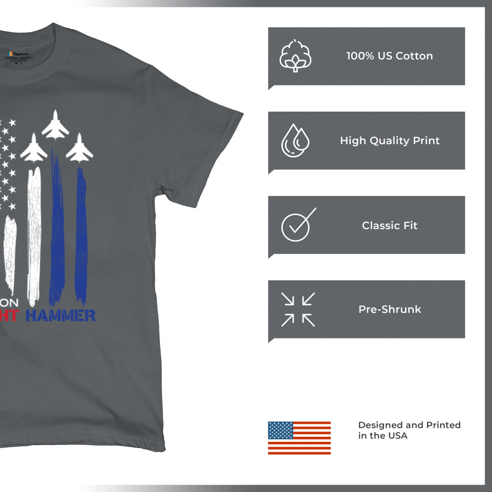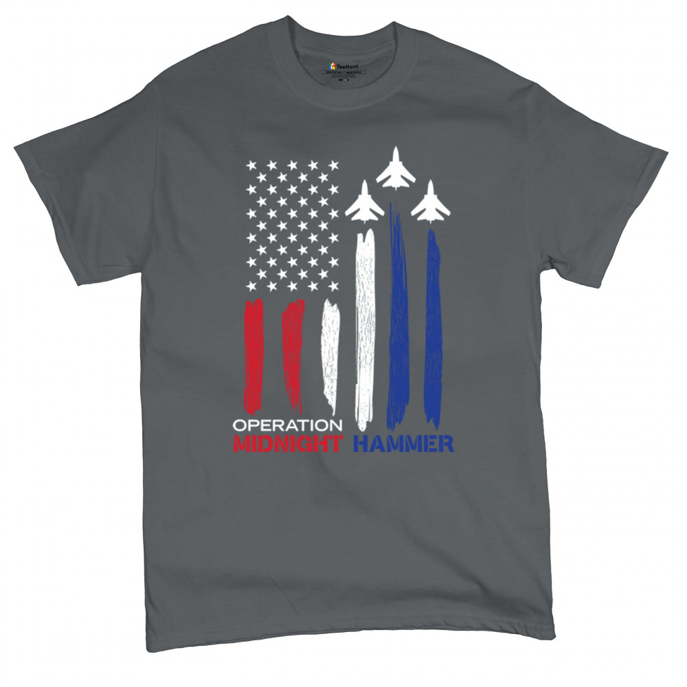 Operation Midnight Hammer captures the spirit of American strength with bold jets soaring over a brushstroke U.S. flag. Designed for patriots, veterans, and conservatives who honor military power, airforce pride, and the fight to preserve national values. Wear it loud, wear it proud.