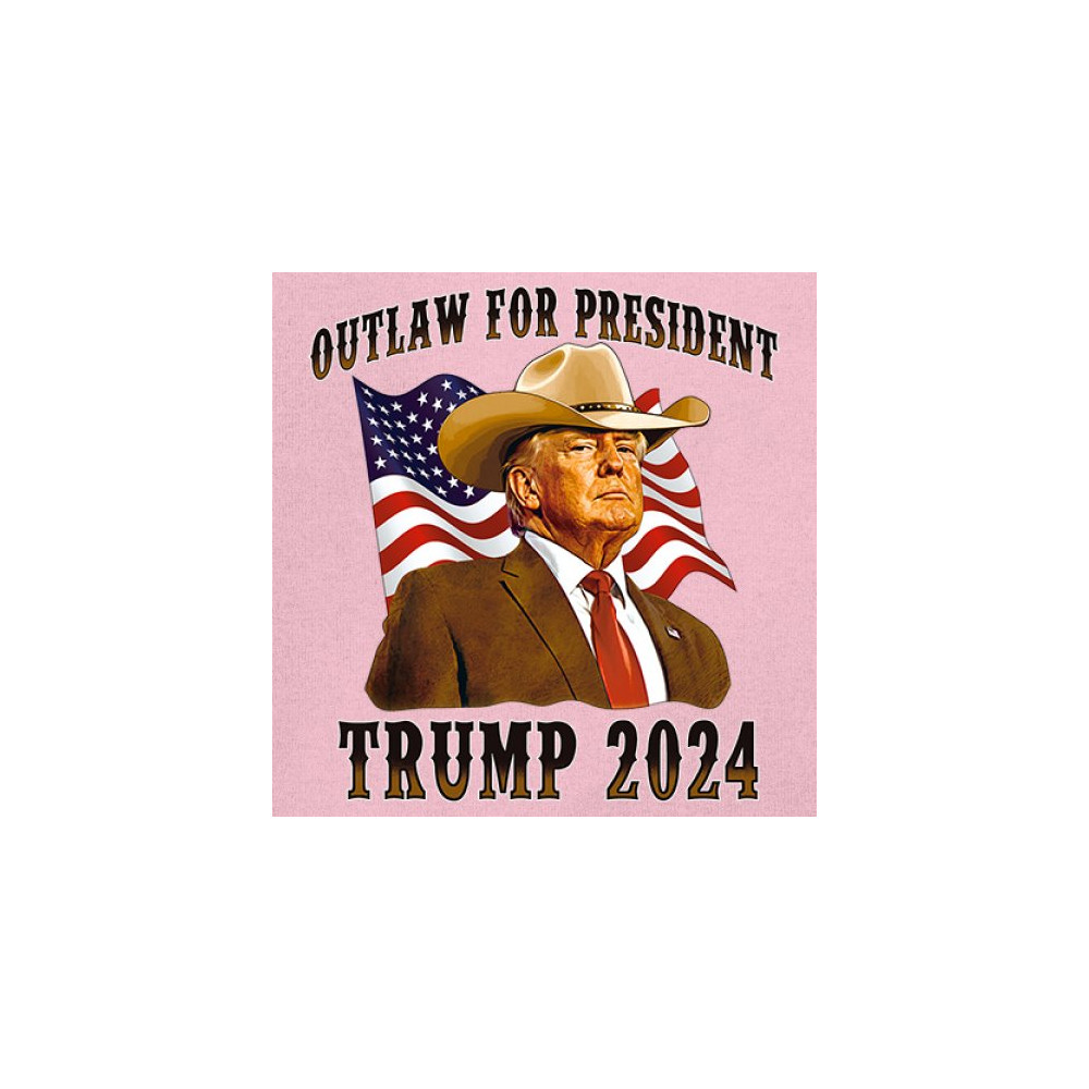 The "Outlaw for President" Trump 2024 design is a powerful symbol of American resilience and conservative pride. Featuring Donald J. Trump in a cowboy hat with the American flag waving behind, this design speaks to supporters who believe in the America First movement, conservative values, and a rebel spirit. Ideal for rallies, patriotic events, and anyone looking to make a bold statement for the 47th President of the United States.