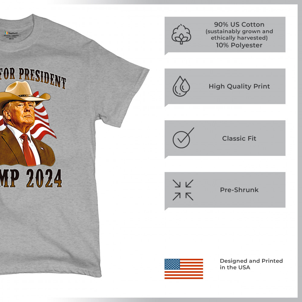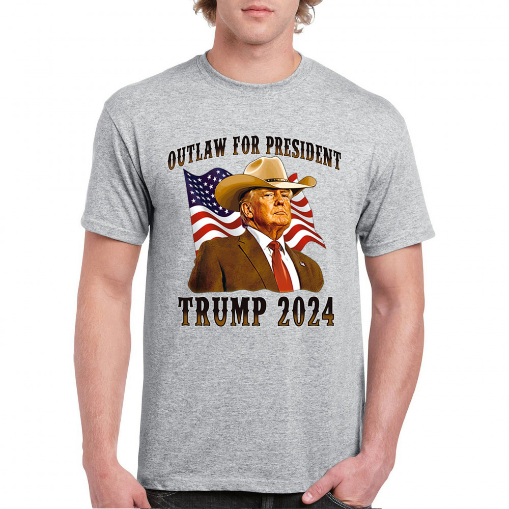 The "Outlaw for President" Trump 2024 design is a powerful symbol of American resilience and conservative pride. Featuring Donald J. Trump in a cowboy hat with the American flag waving behind, this design speaks to supporters who believe in the America First movement, conservative values, and a rebel spirit. Ideal for rallies, patriotic events, and anyone looking to make a bold statement for the 47th President of the United States.